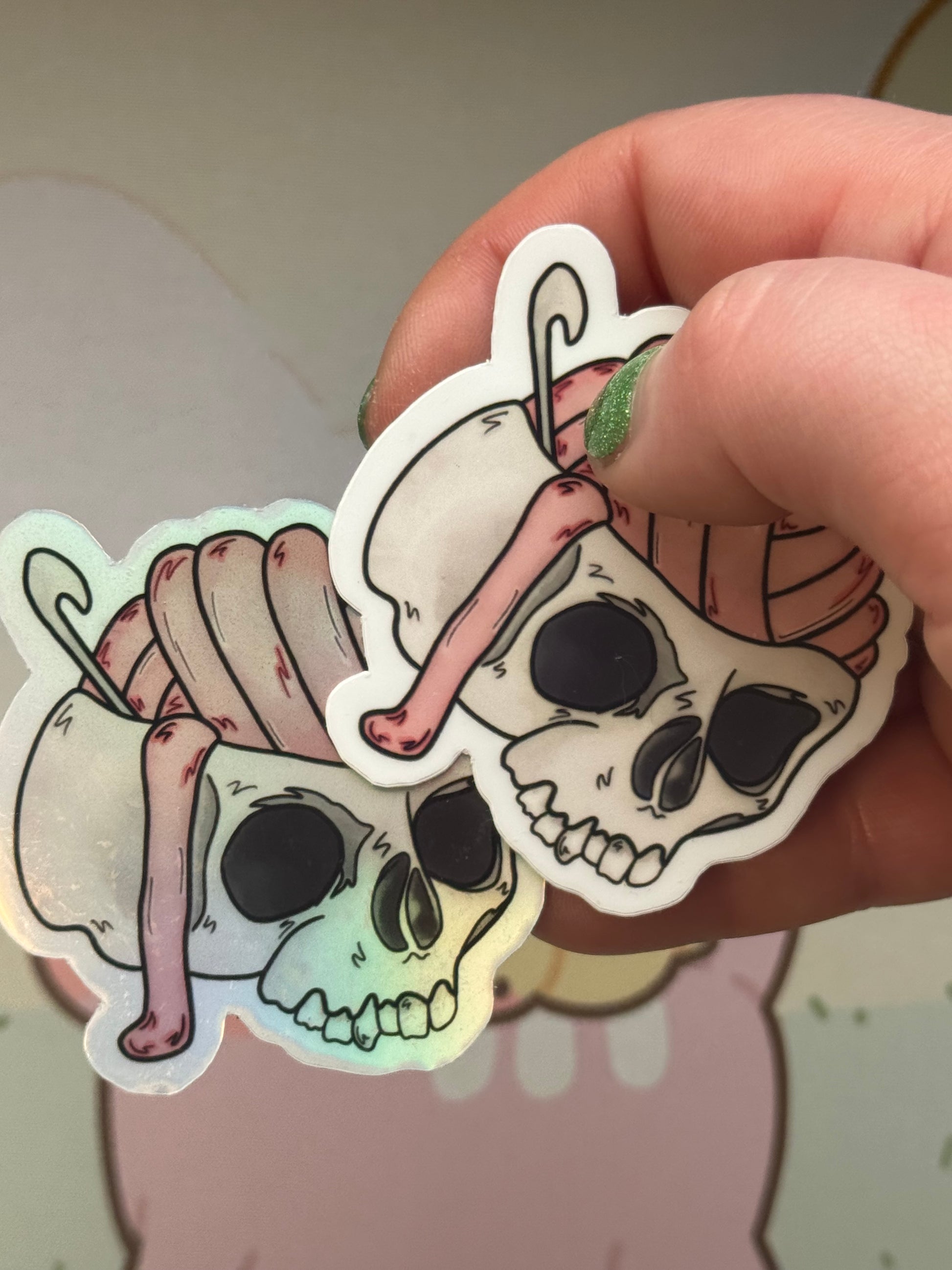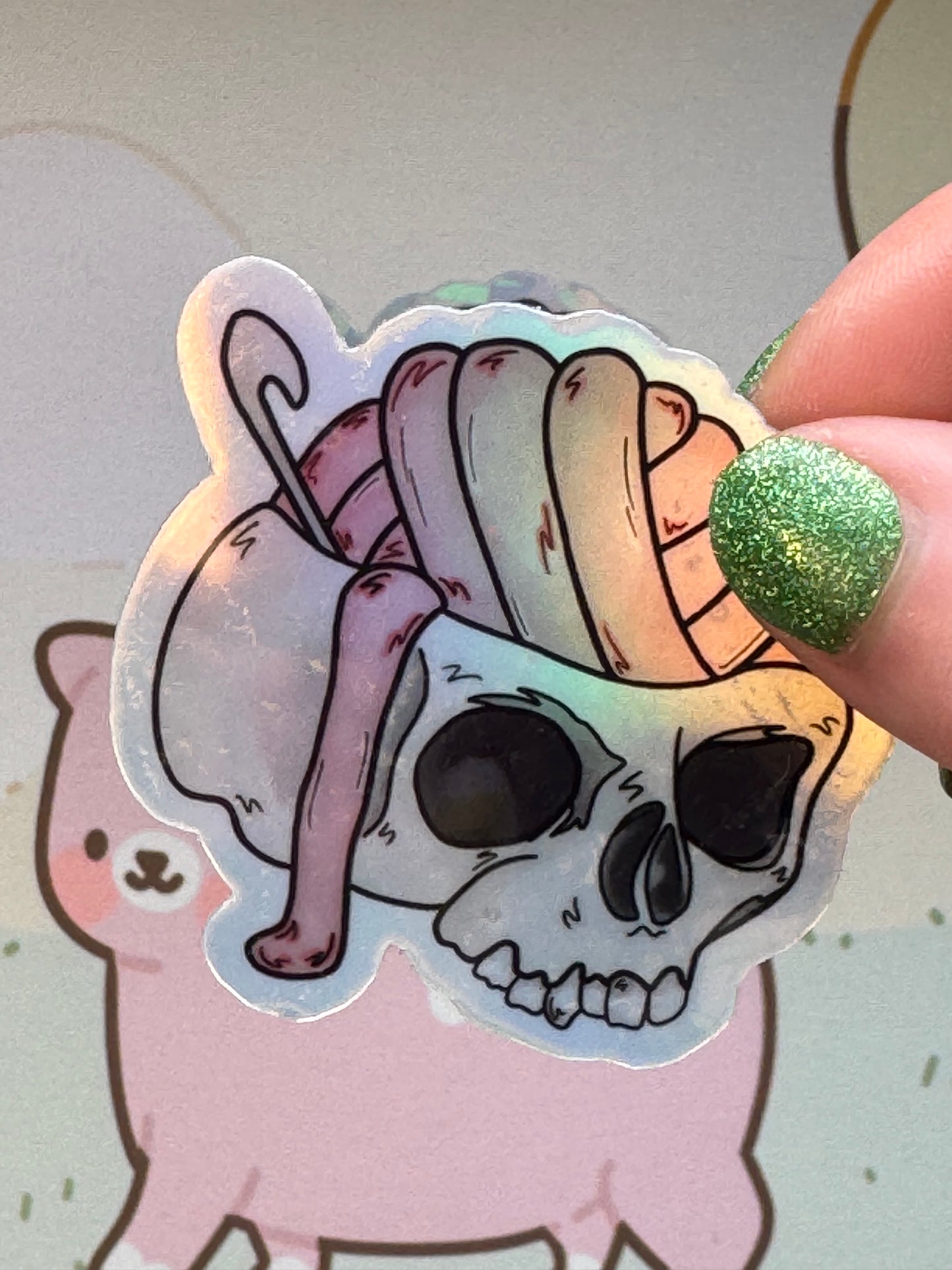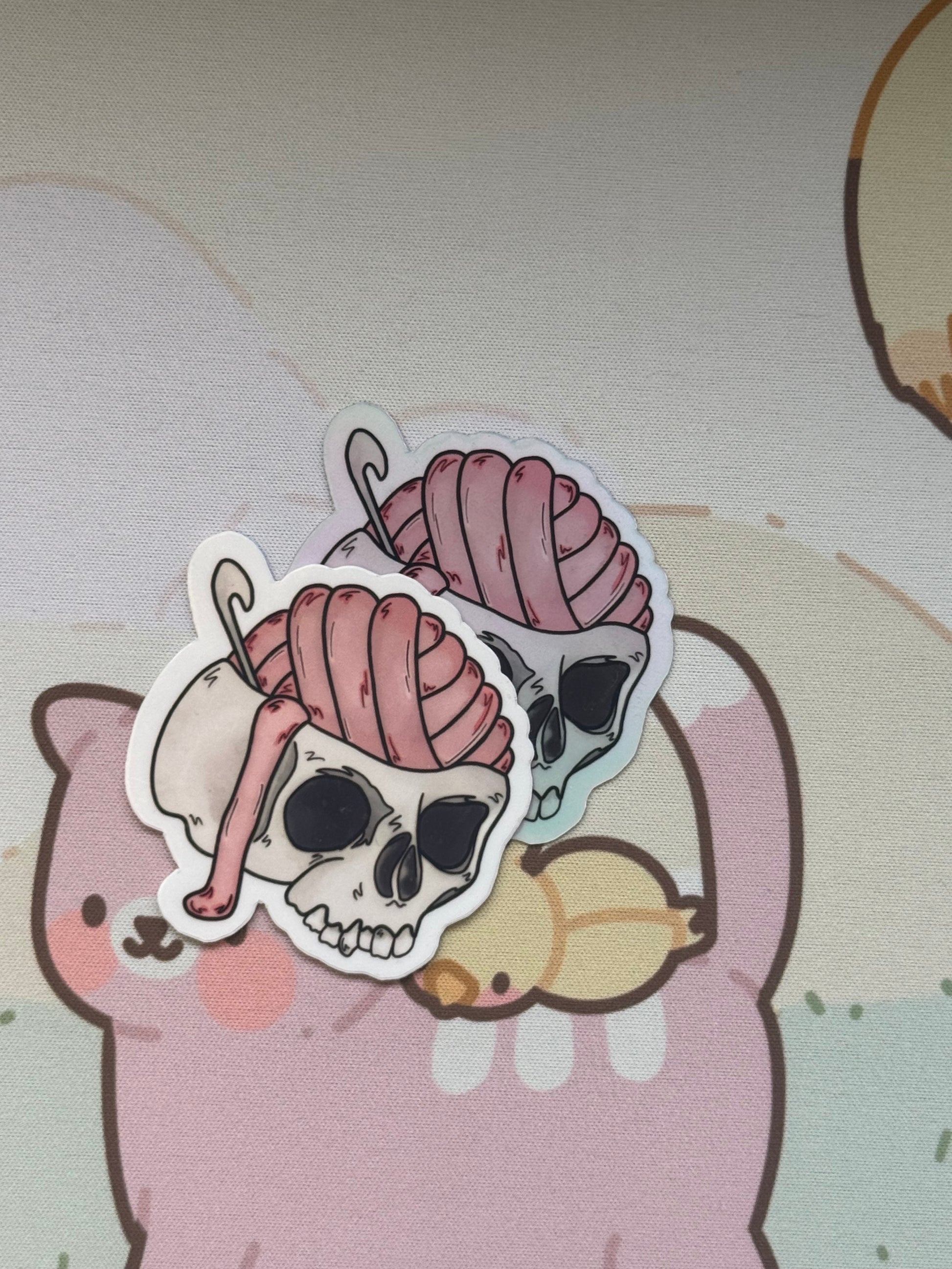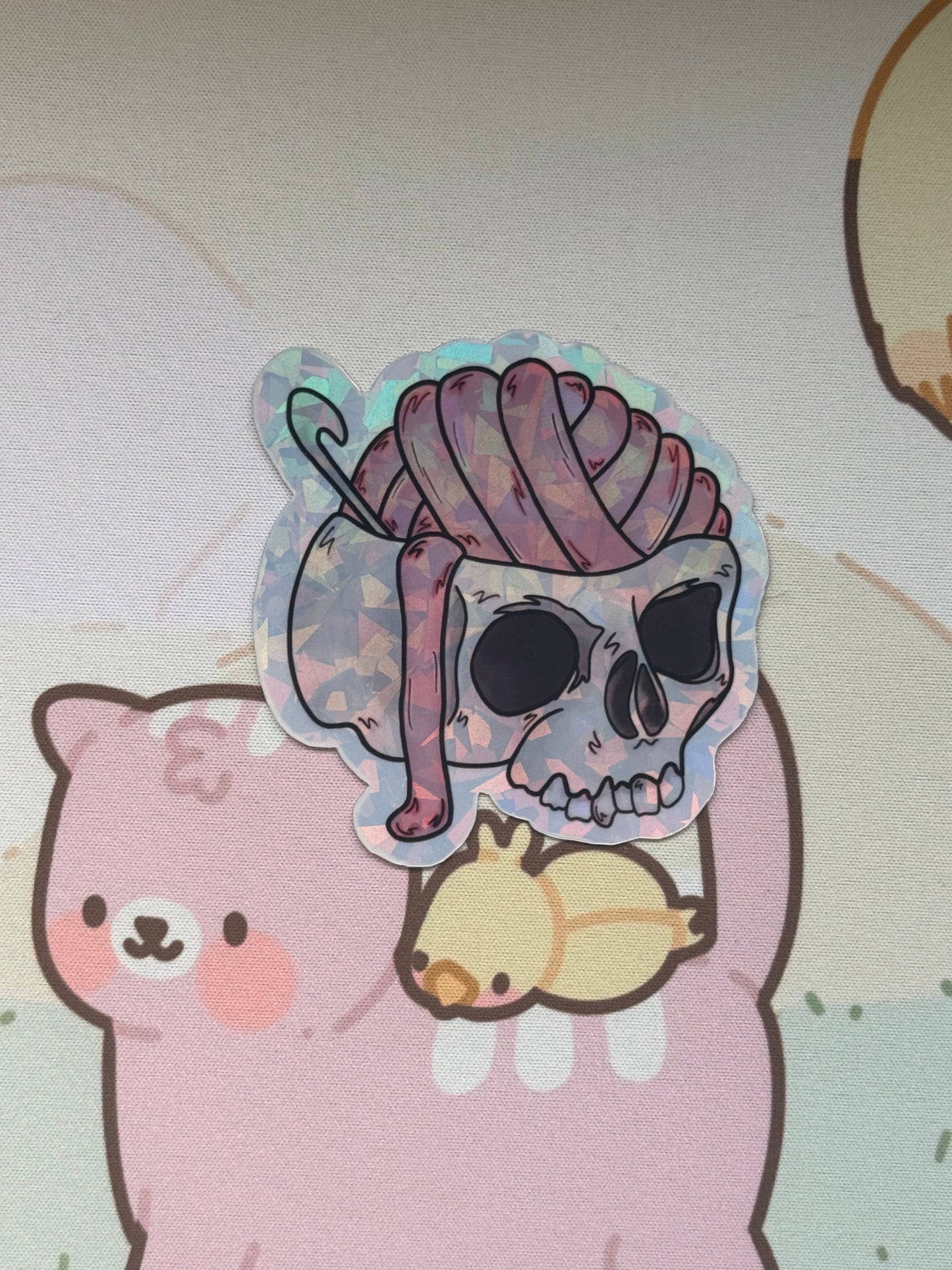This sticker shows my skull with yarn for brains design! It comes in 4 finishes: white glossy, rainbow holographic, cracked glass holographic, or glow in the dark!