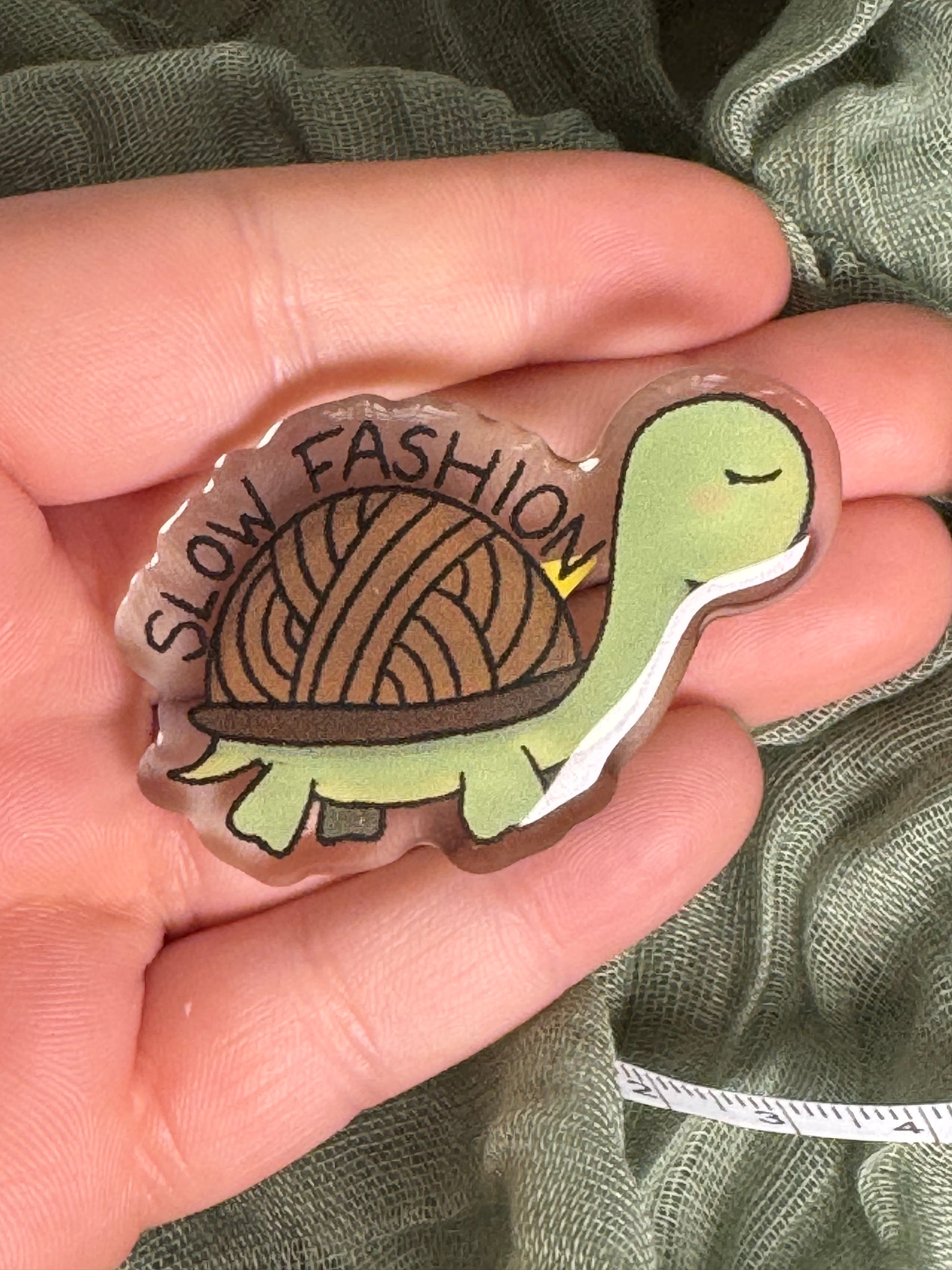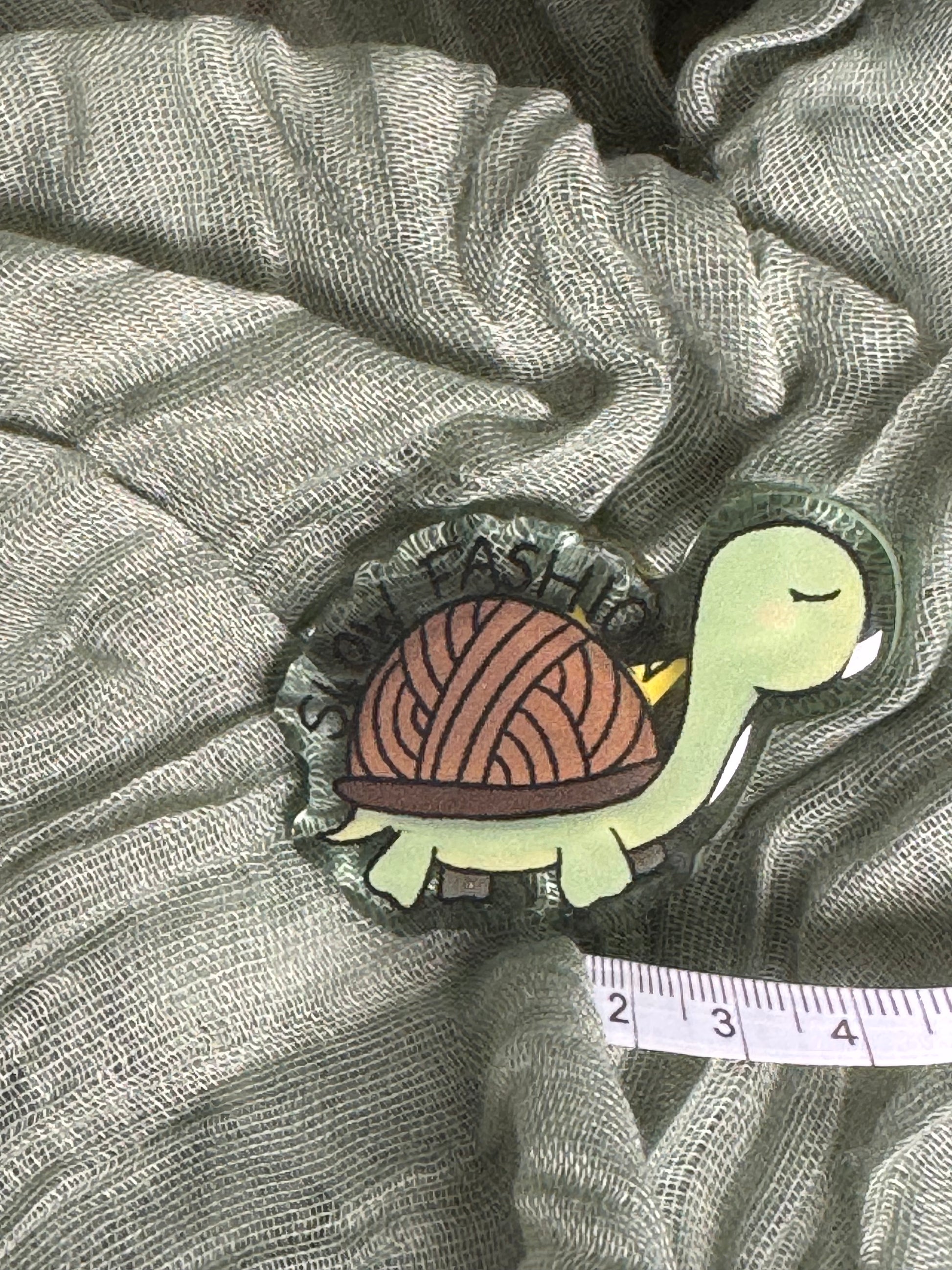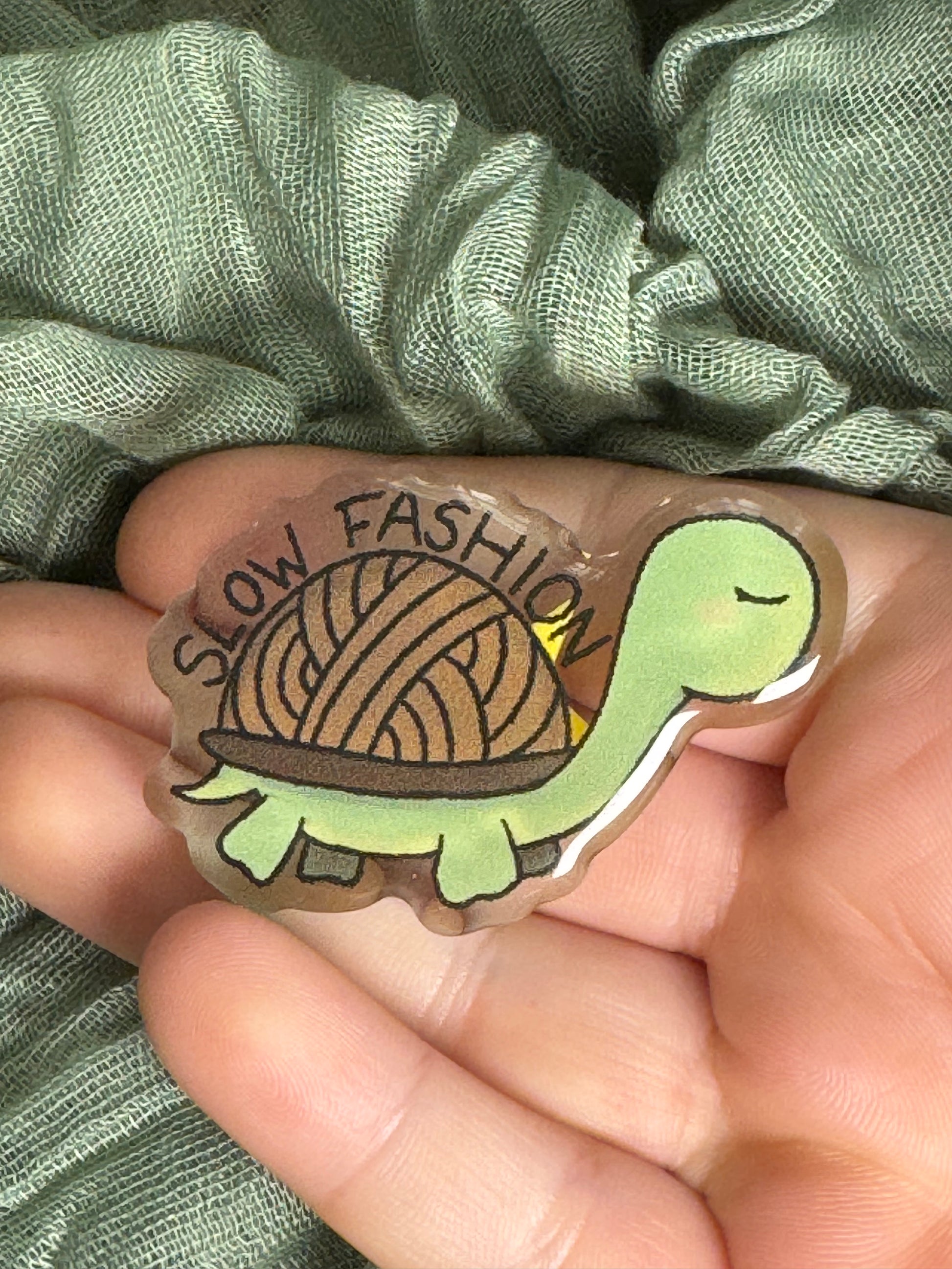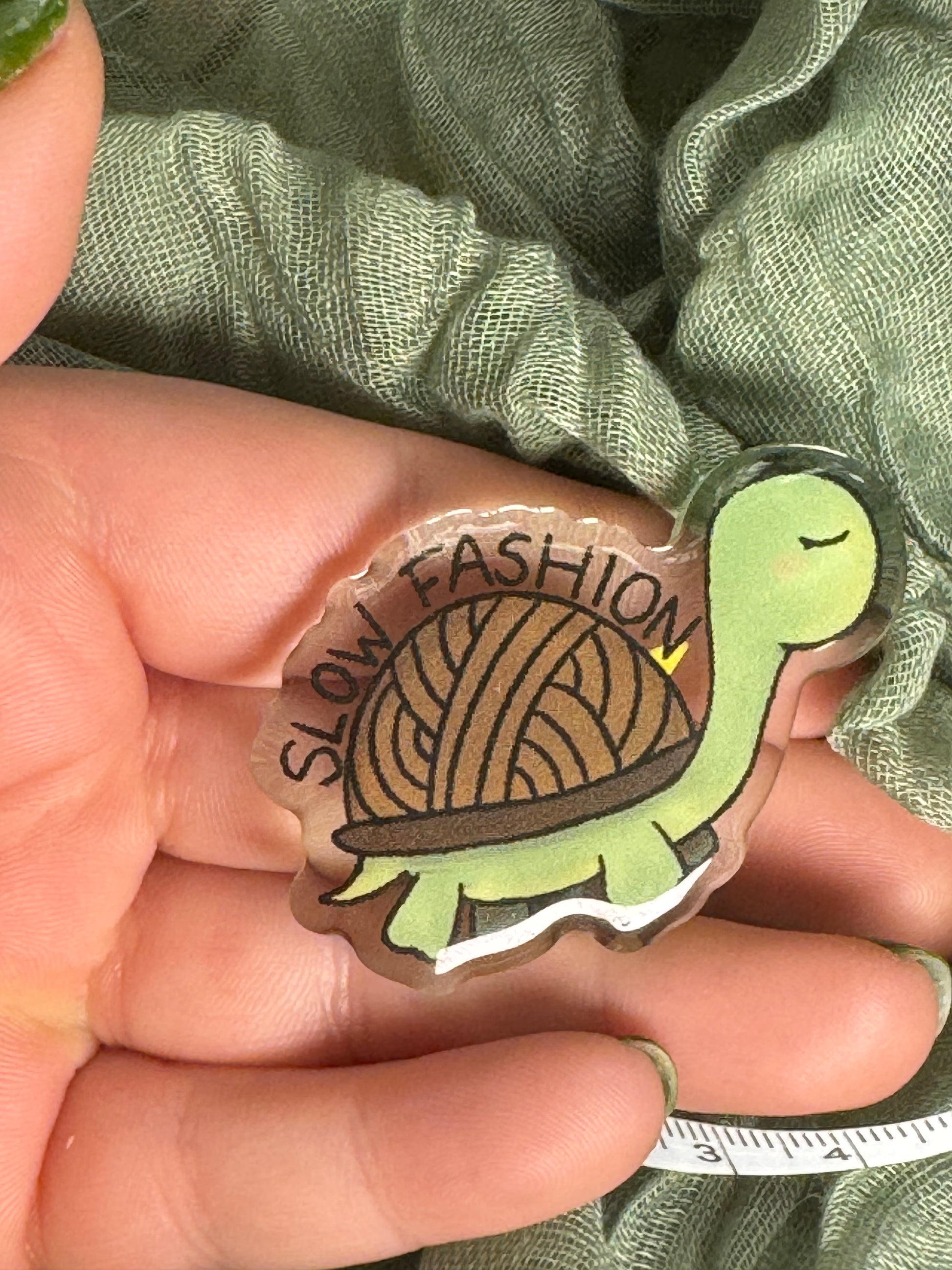 Acrylic pin badge with my tortoise with a yarn shell and the words "slow fashion" on it. This badge is 2 inches at its largest dimension, and has a rubber star clutch and pin post in the centre of the back. It is printed onto light green acrylic and has a domed epoxy finish.