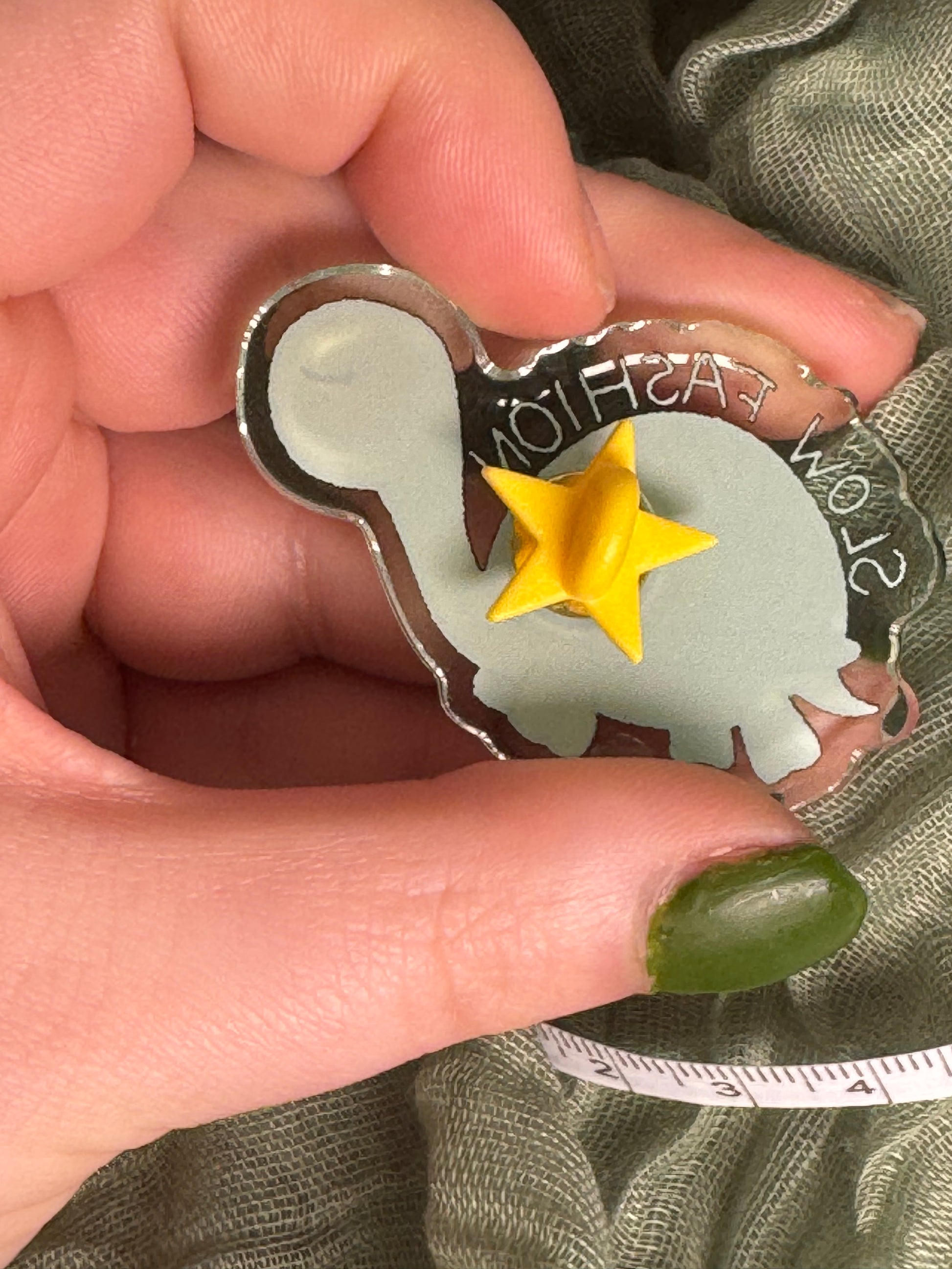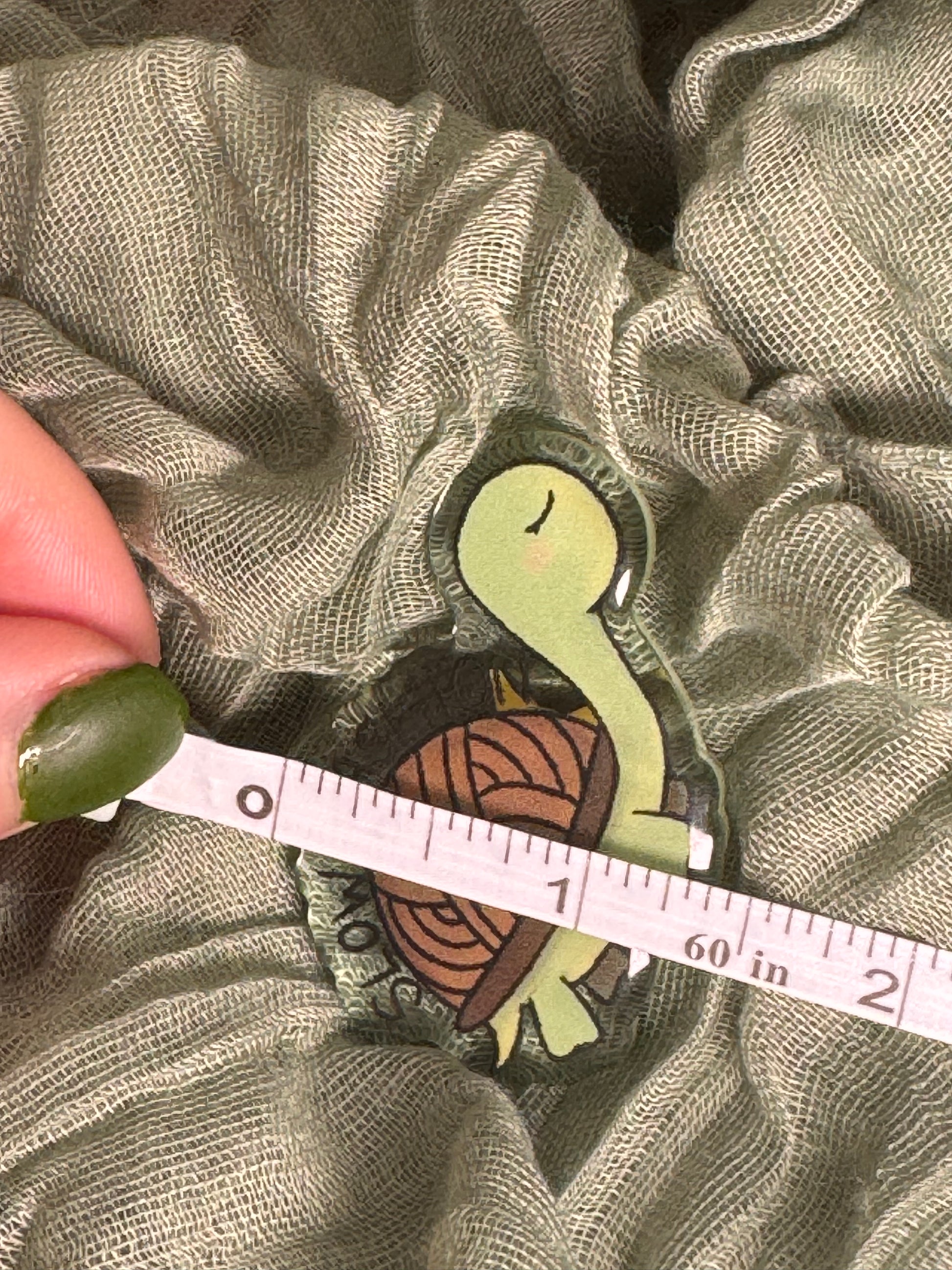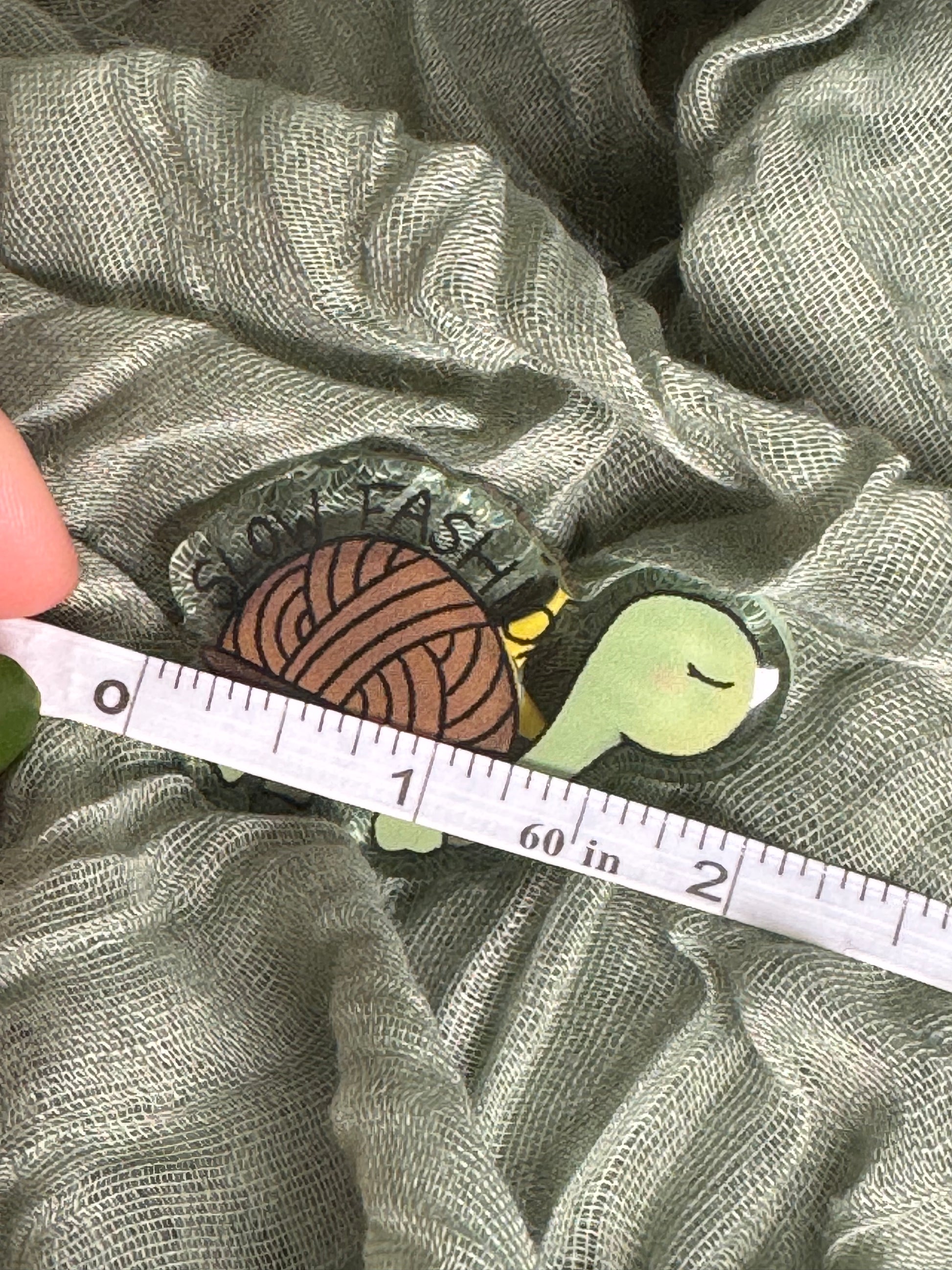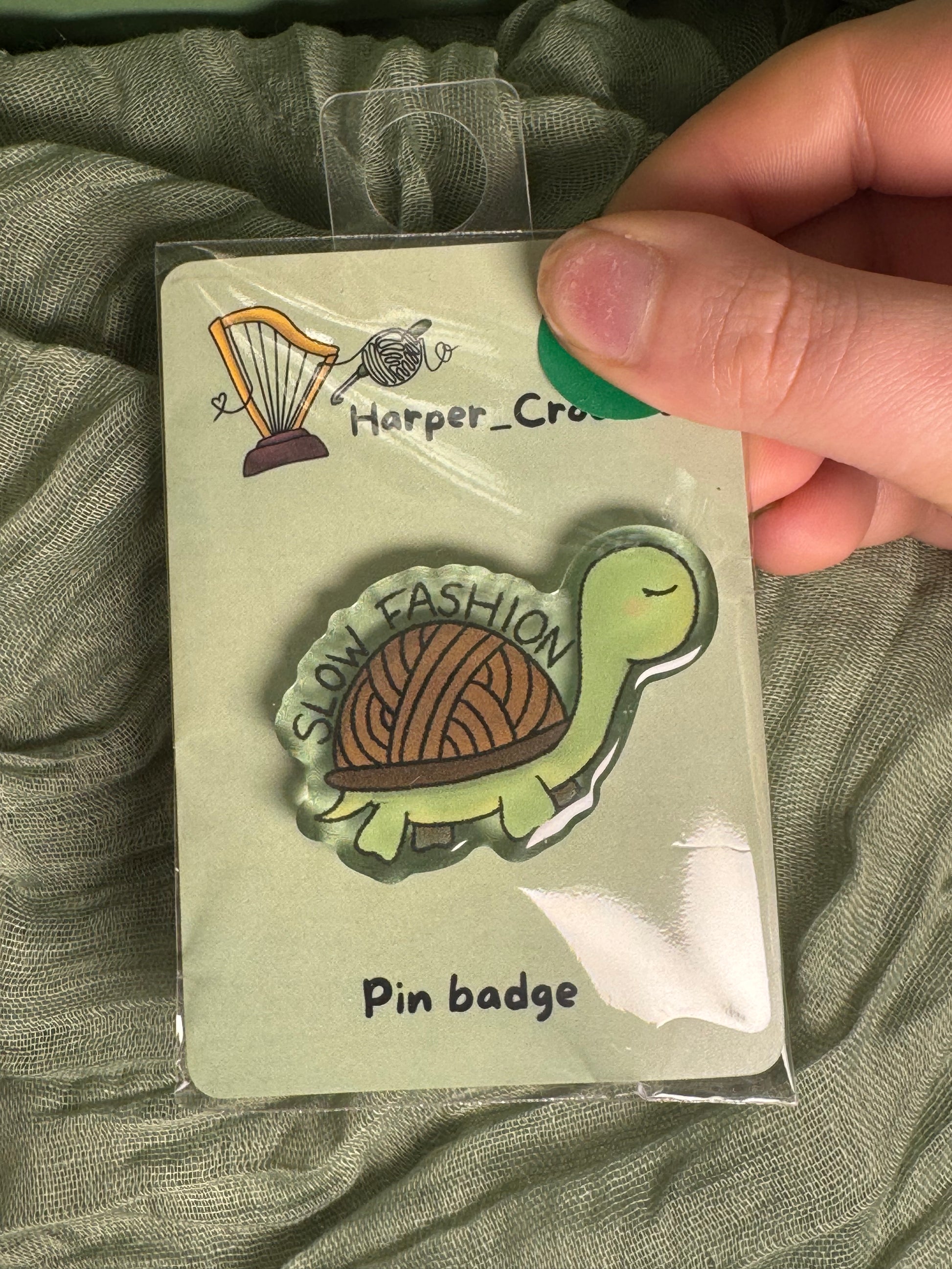 Acrylic pin badge with my tortoise with a yarn shell and the words "slow fashion" on it. This badge is 2 inches at its largest dimension, and has a rubber star clutch and pin post in the centre of the back. It is printed onto light green acrylic and has a domed epoxy finish.