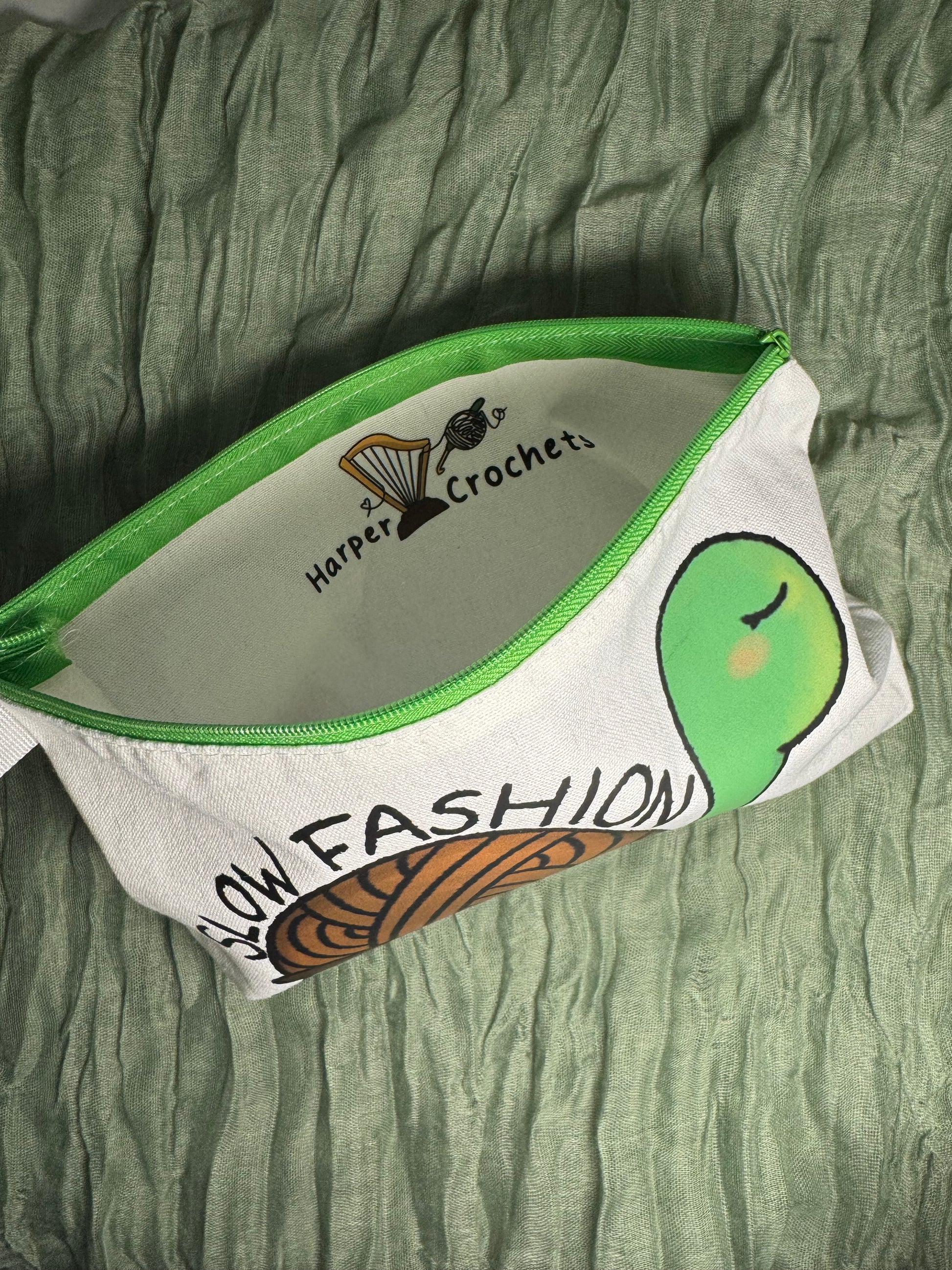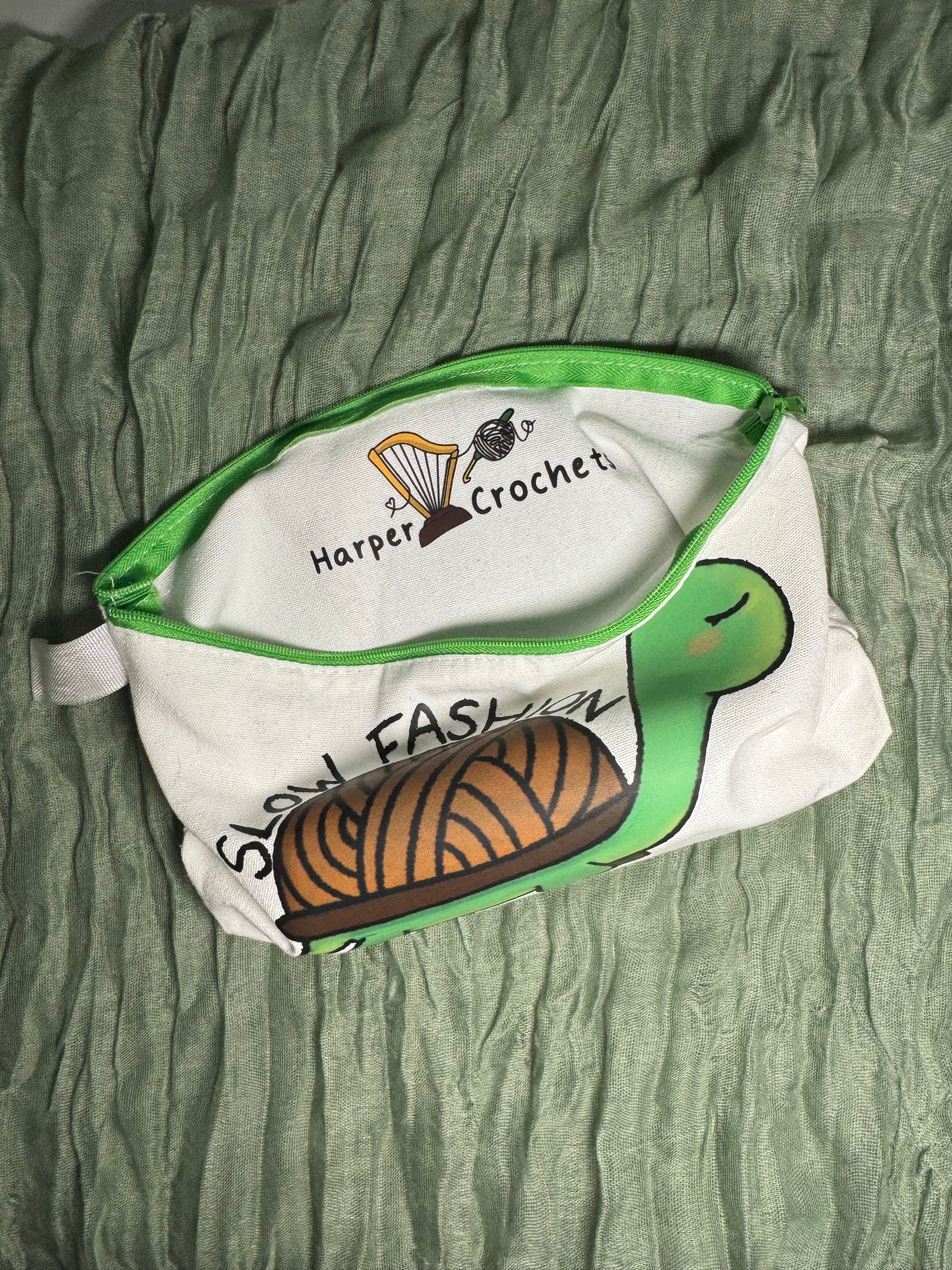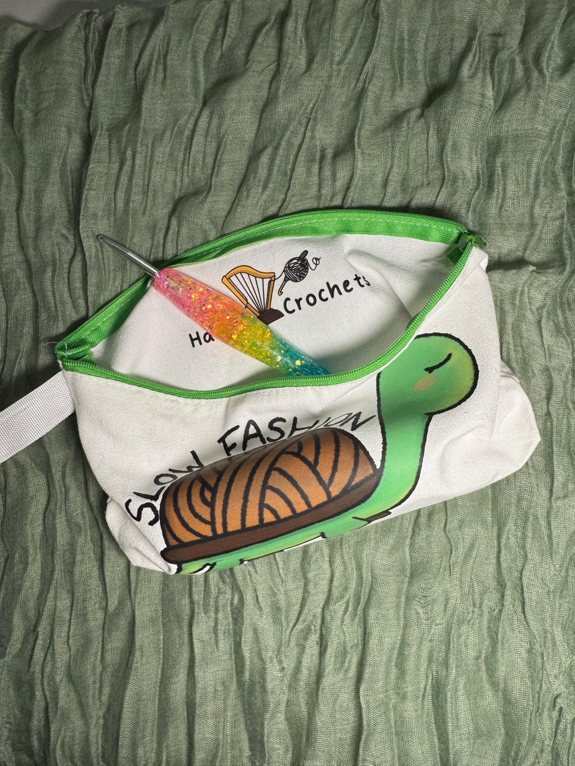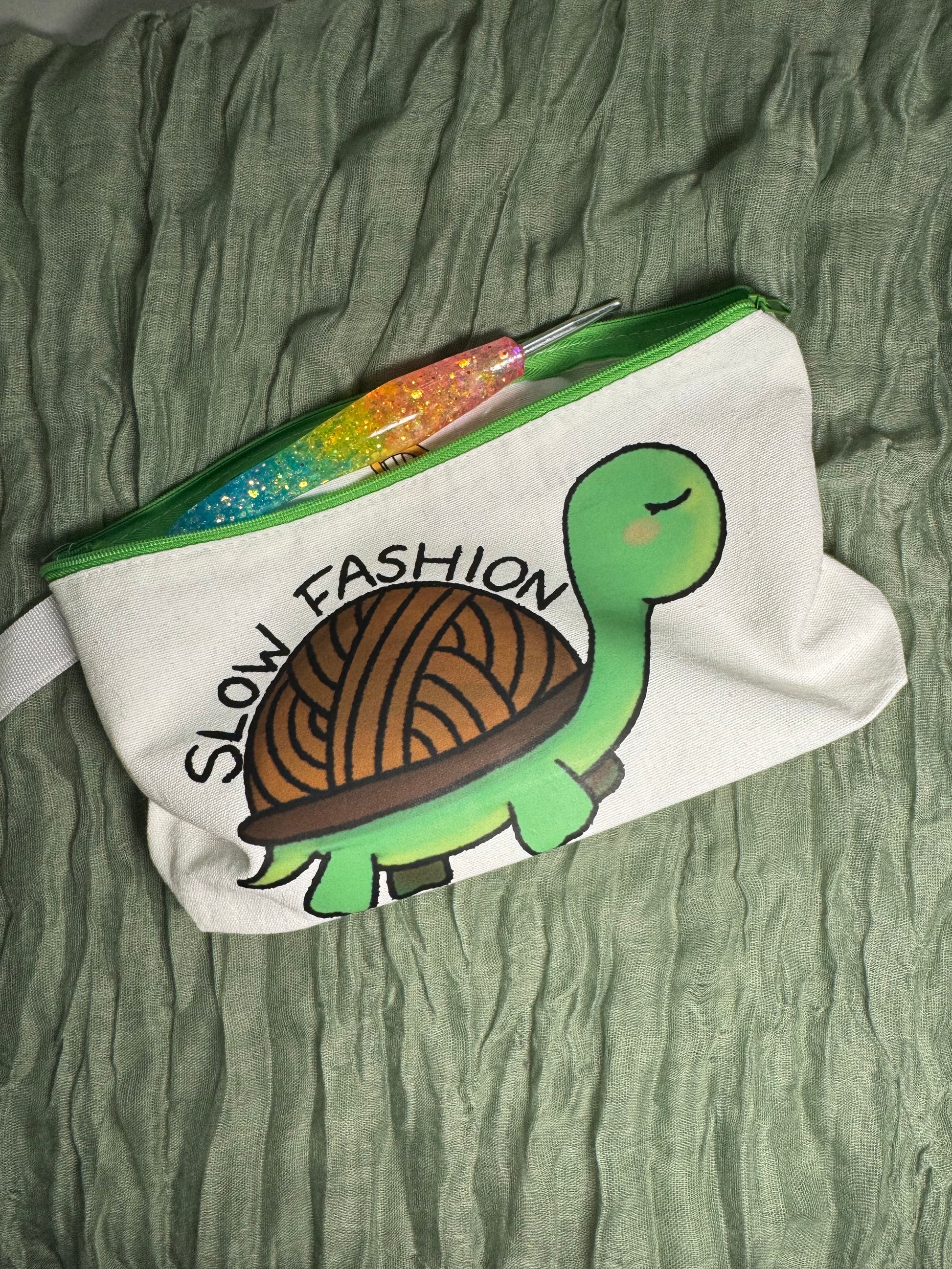 Featuring my design of a tortoise with a yarn shell and the words "slow fashion"! Perfect for your hooks and notions, this crochet hook case measures 25cm long, 13cm tall, and has a depth of 4.5cm thanks to a gusset at the bottom, which expands as you fill the case! It has a green sturdy zip closure for keeping all your hooks and stitch markers secure, instead of spilling out all over your bag!