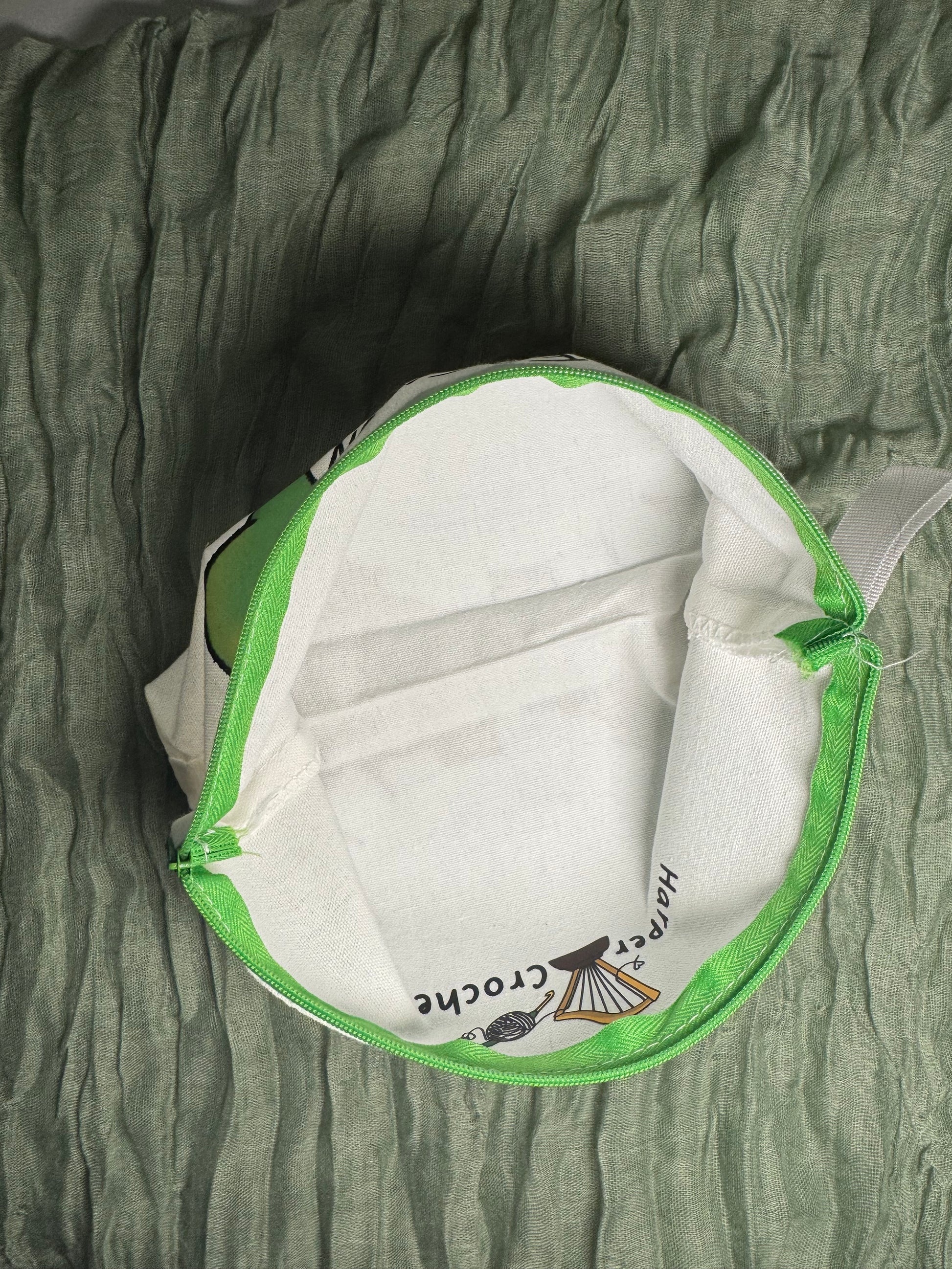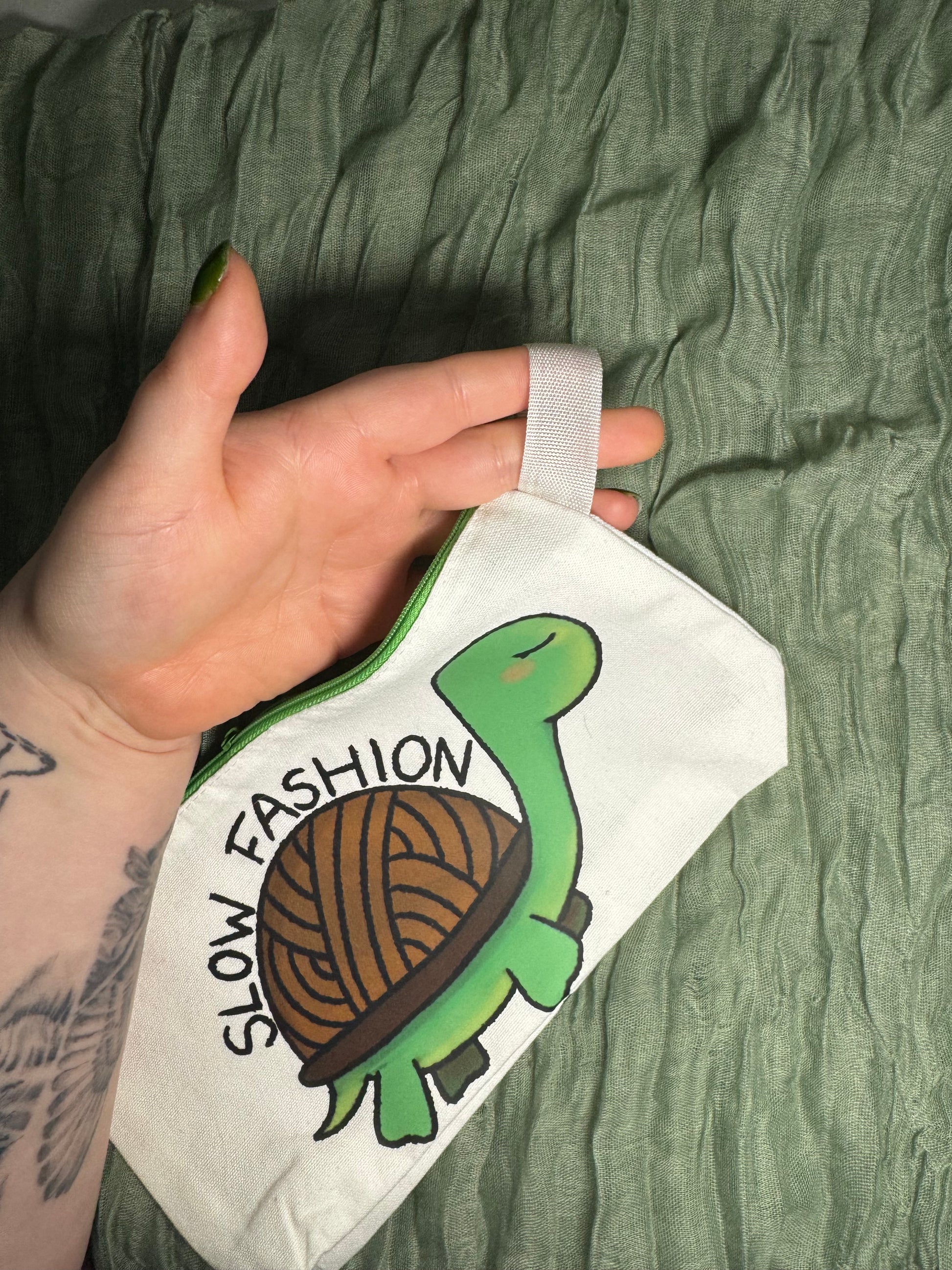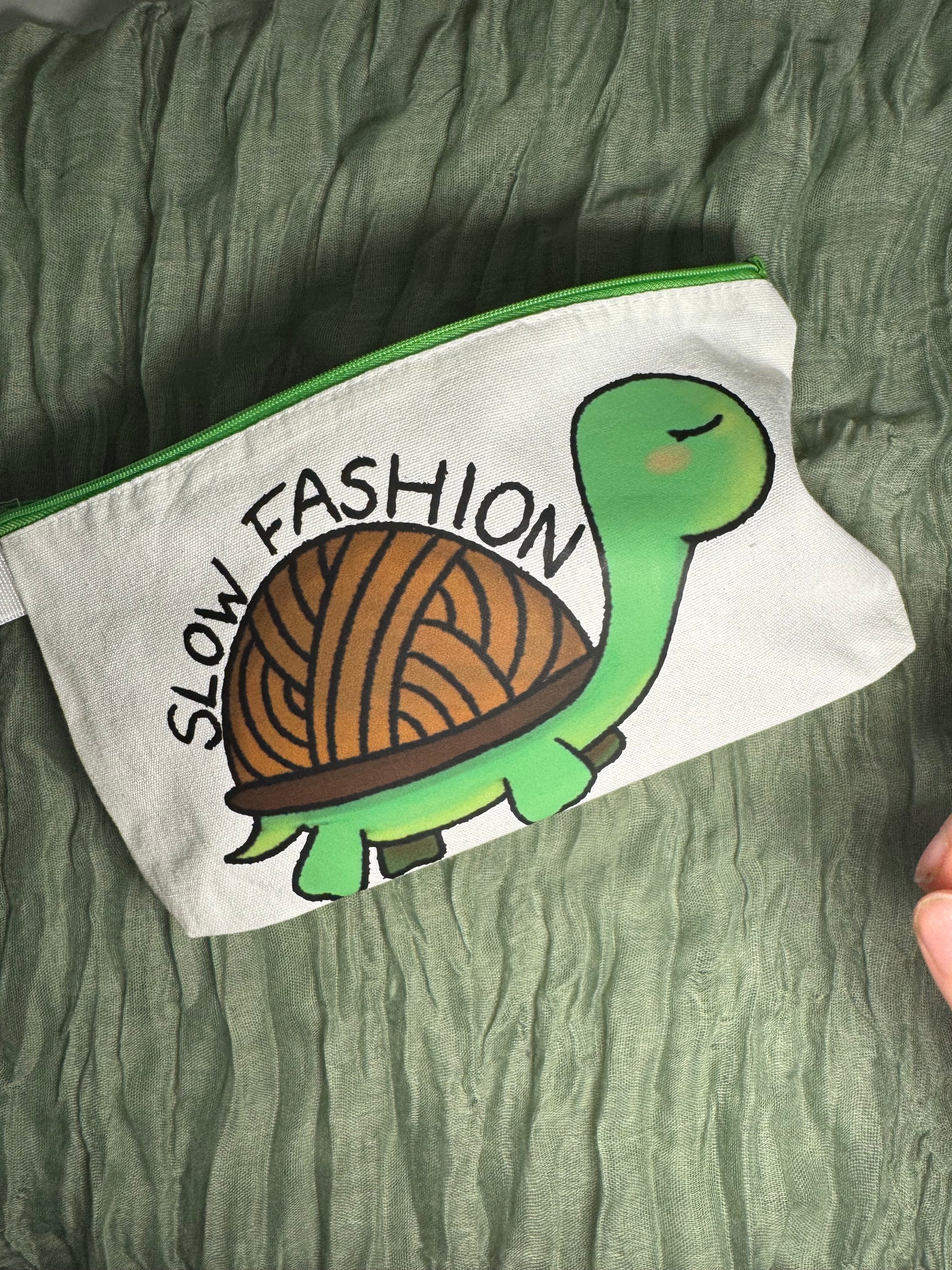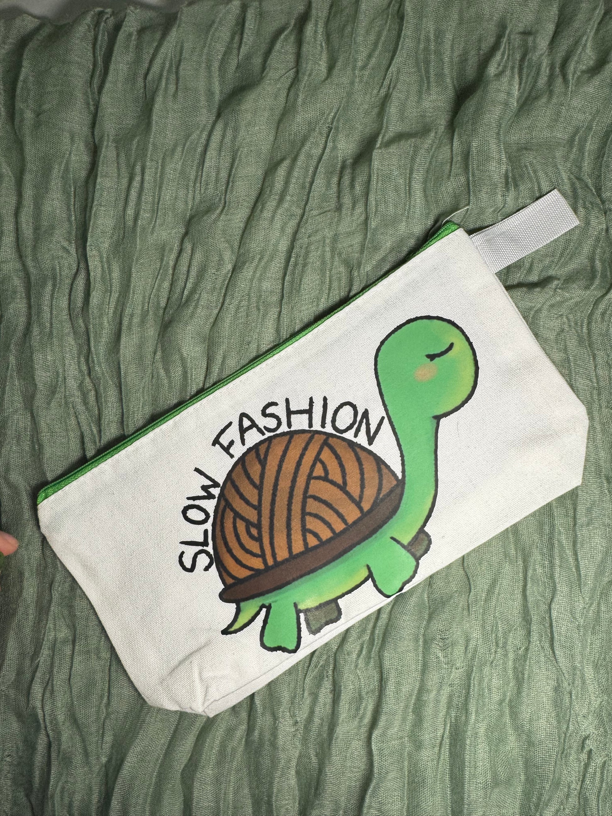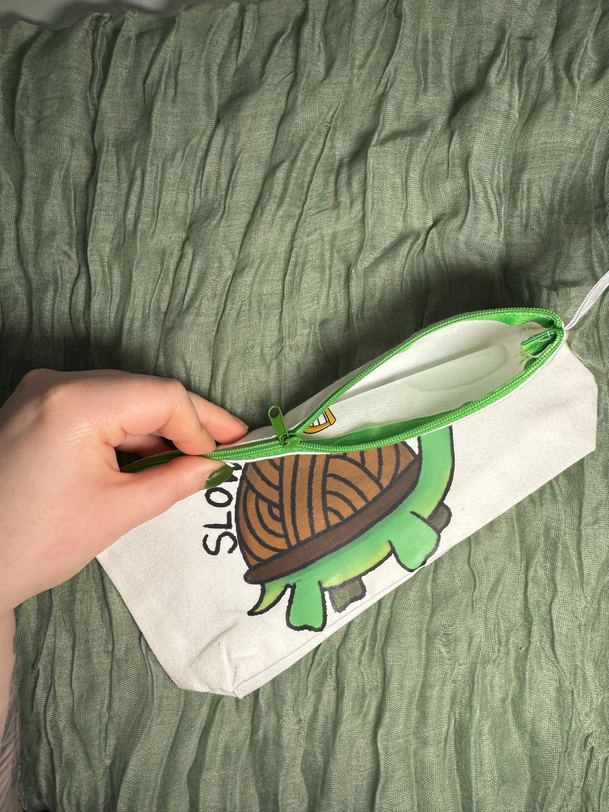 Featuring my design of a tortoise with a yarn shell and the words "slow fashion"! Perfect for your hooks and notions, this crochet hook case measures 25cm long, 13cm tall, and has a depth of 4.5cm thanks to a gusset at the bottom, which expands as you fill the case! It has a green sturdy zip closure for keeping all your hooks and stitch markers secure, instead of spilling out all over your bag!