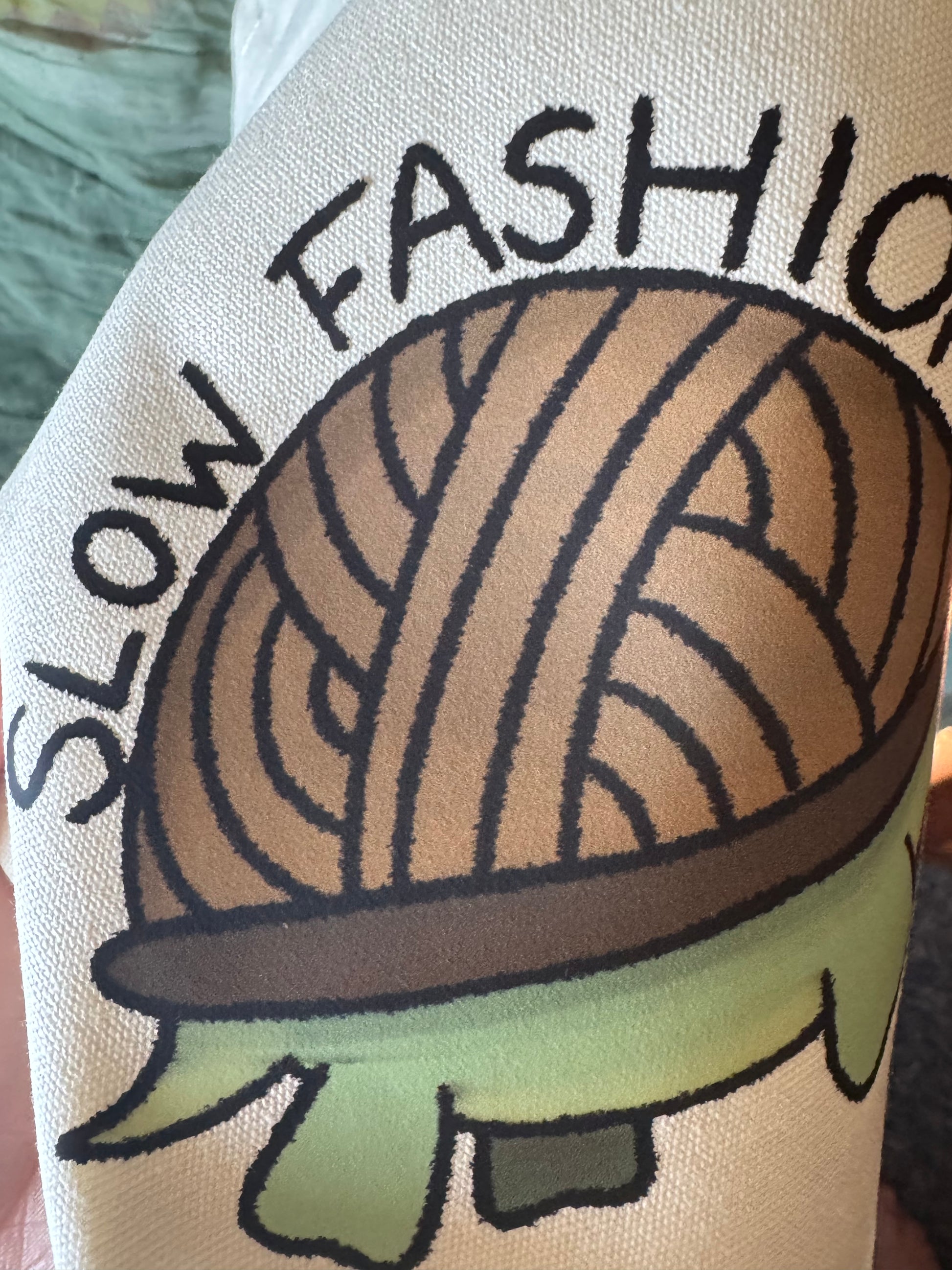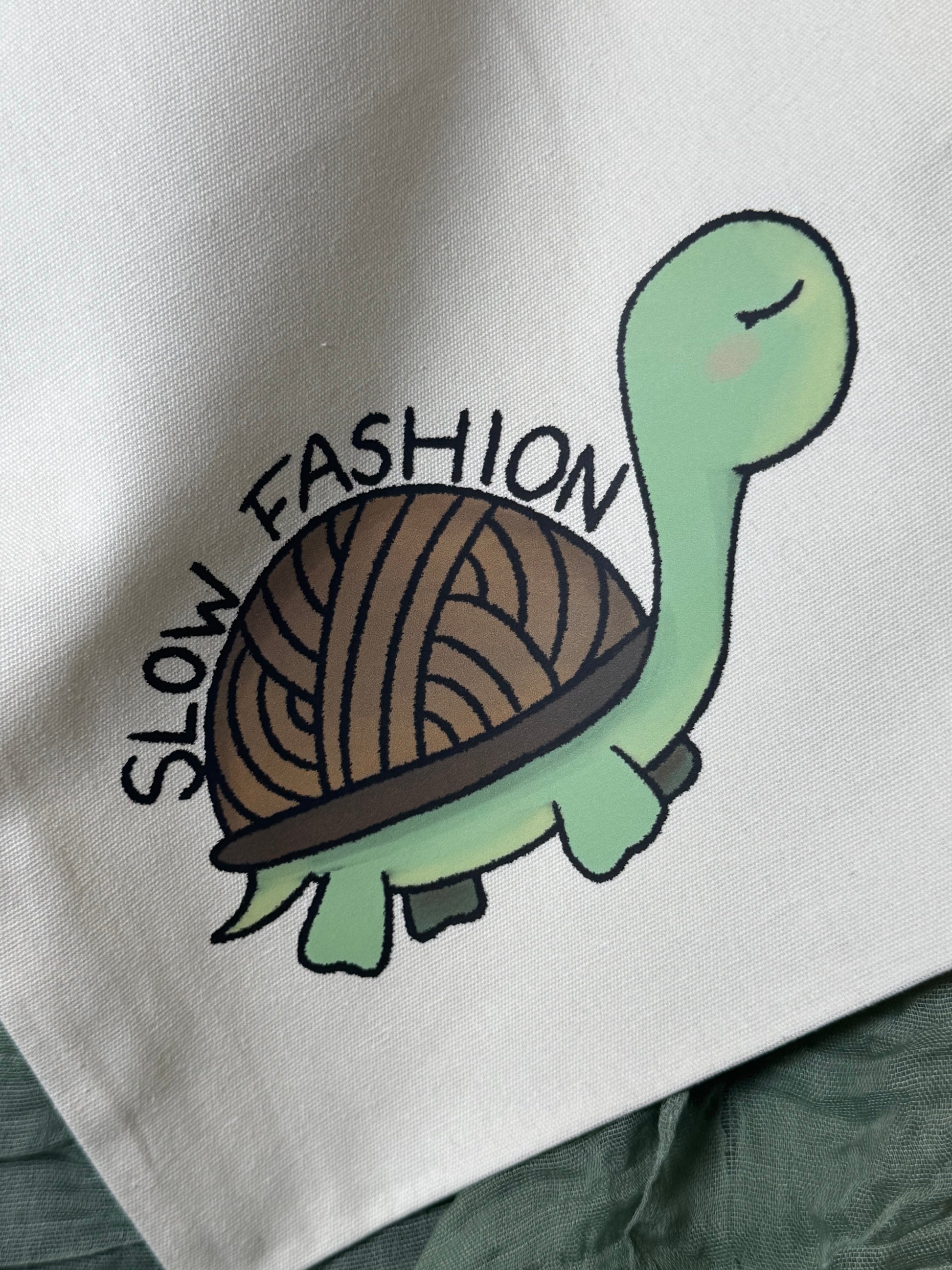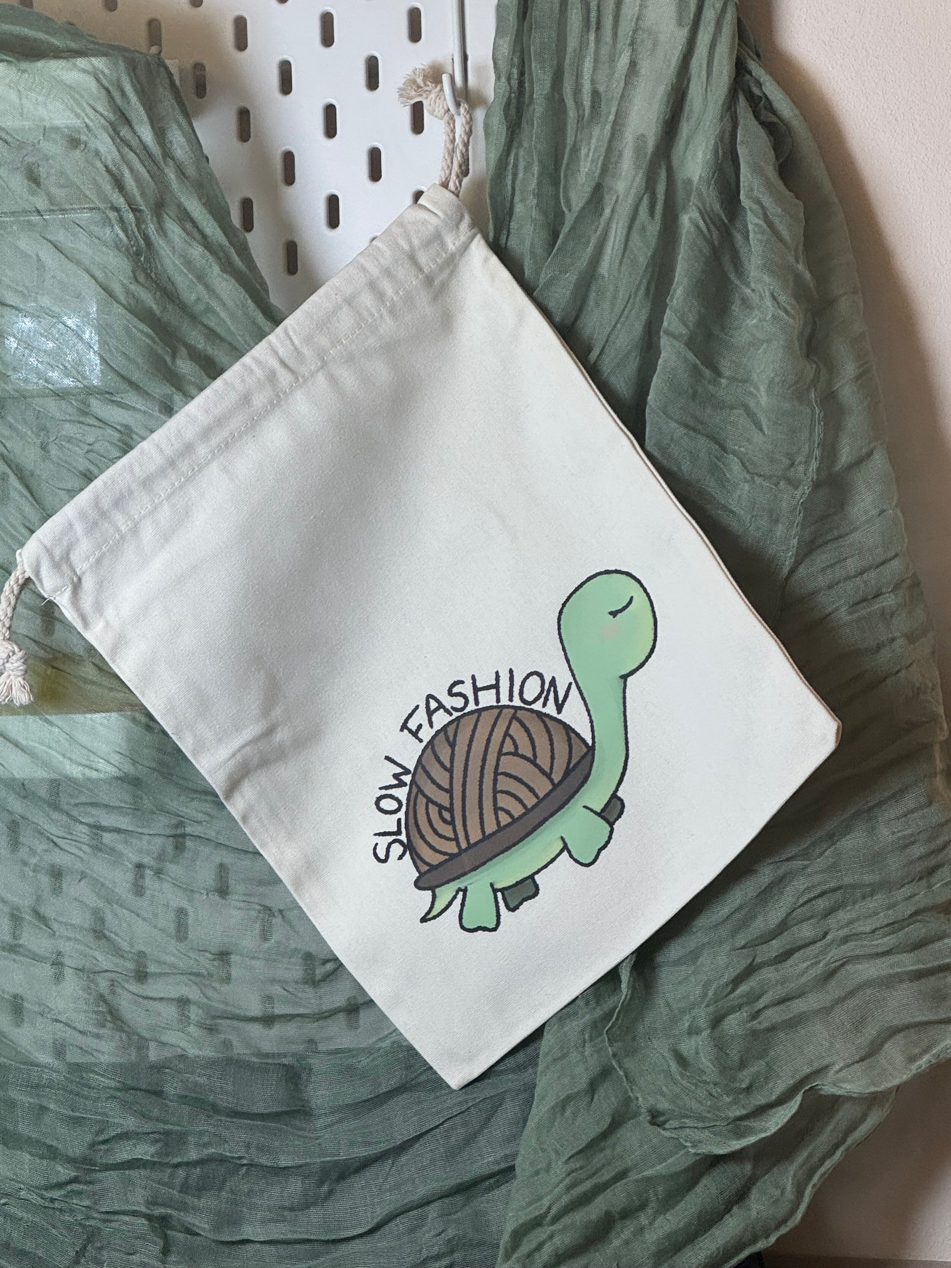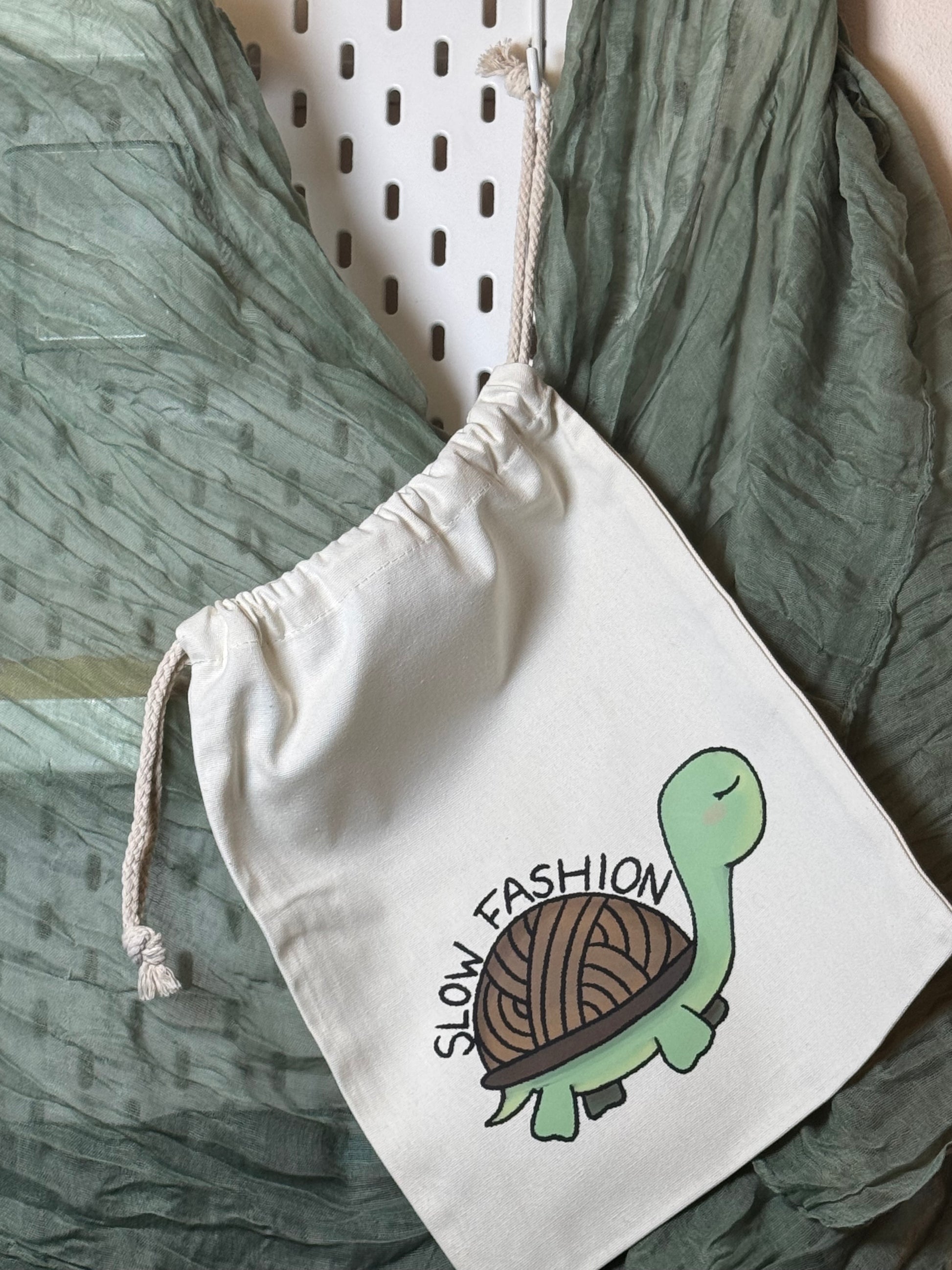 Project bag featuring my tortoise with a ball of yarn shell and the words "slow fashion" design.