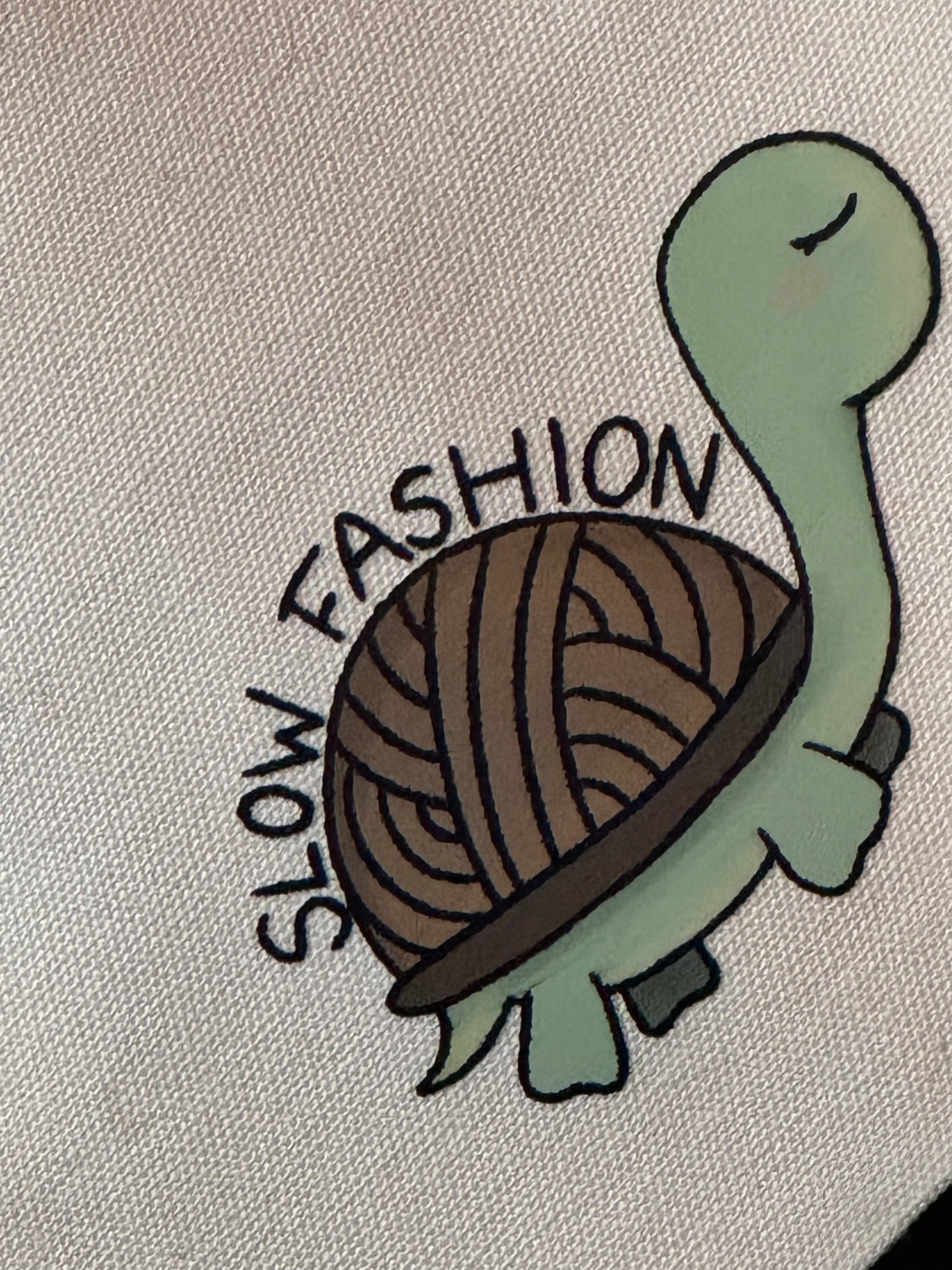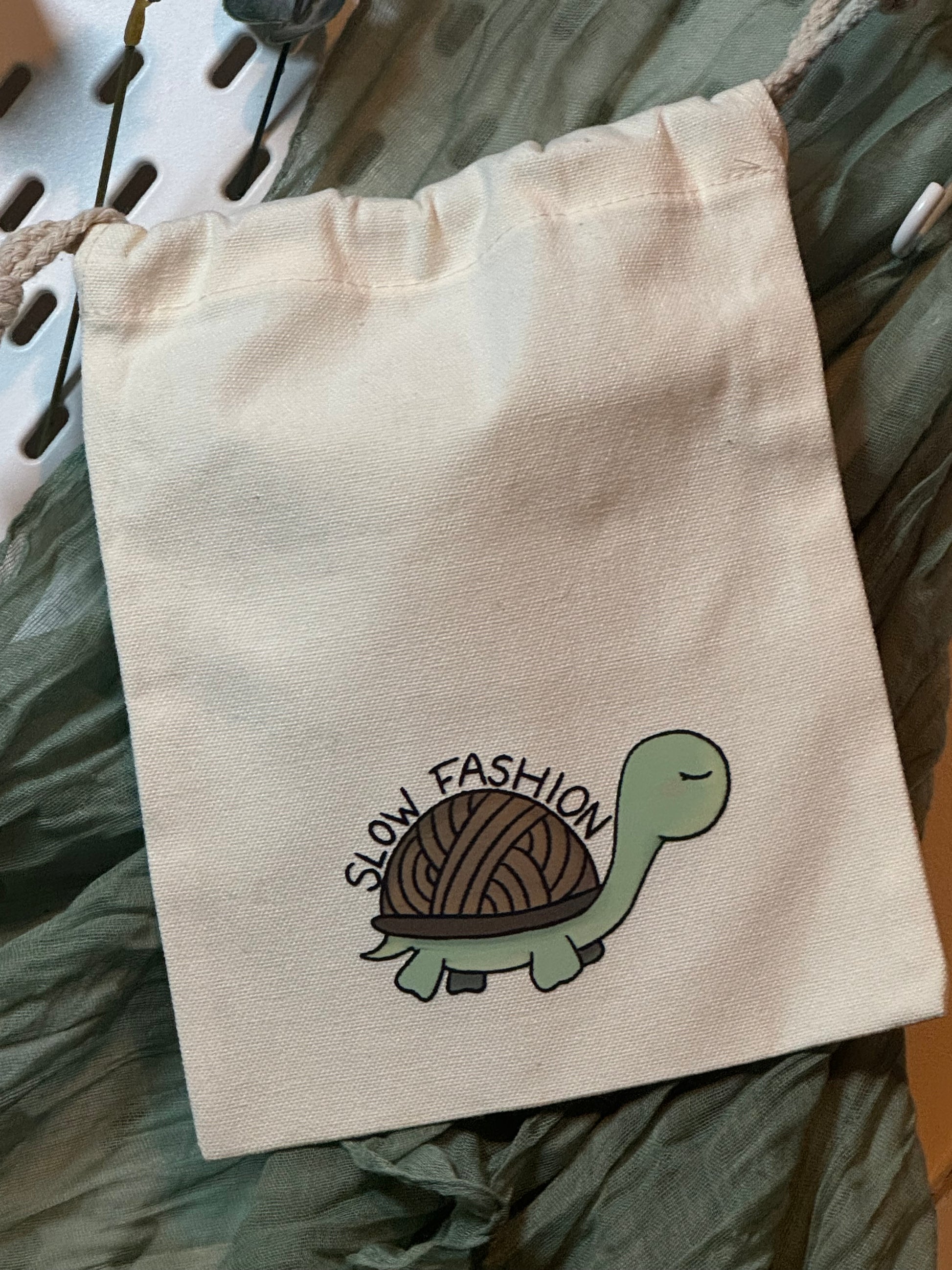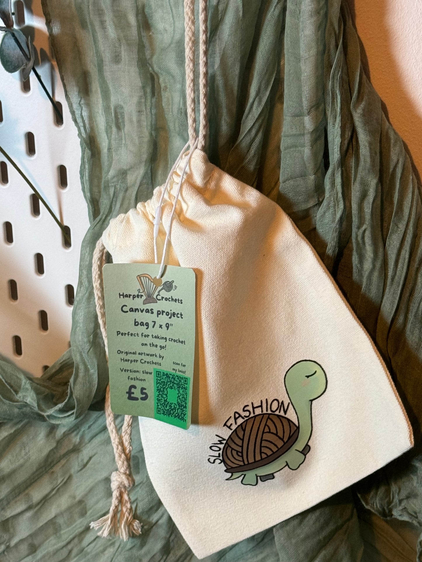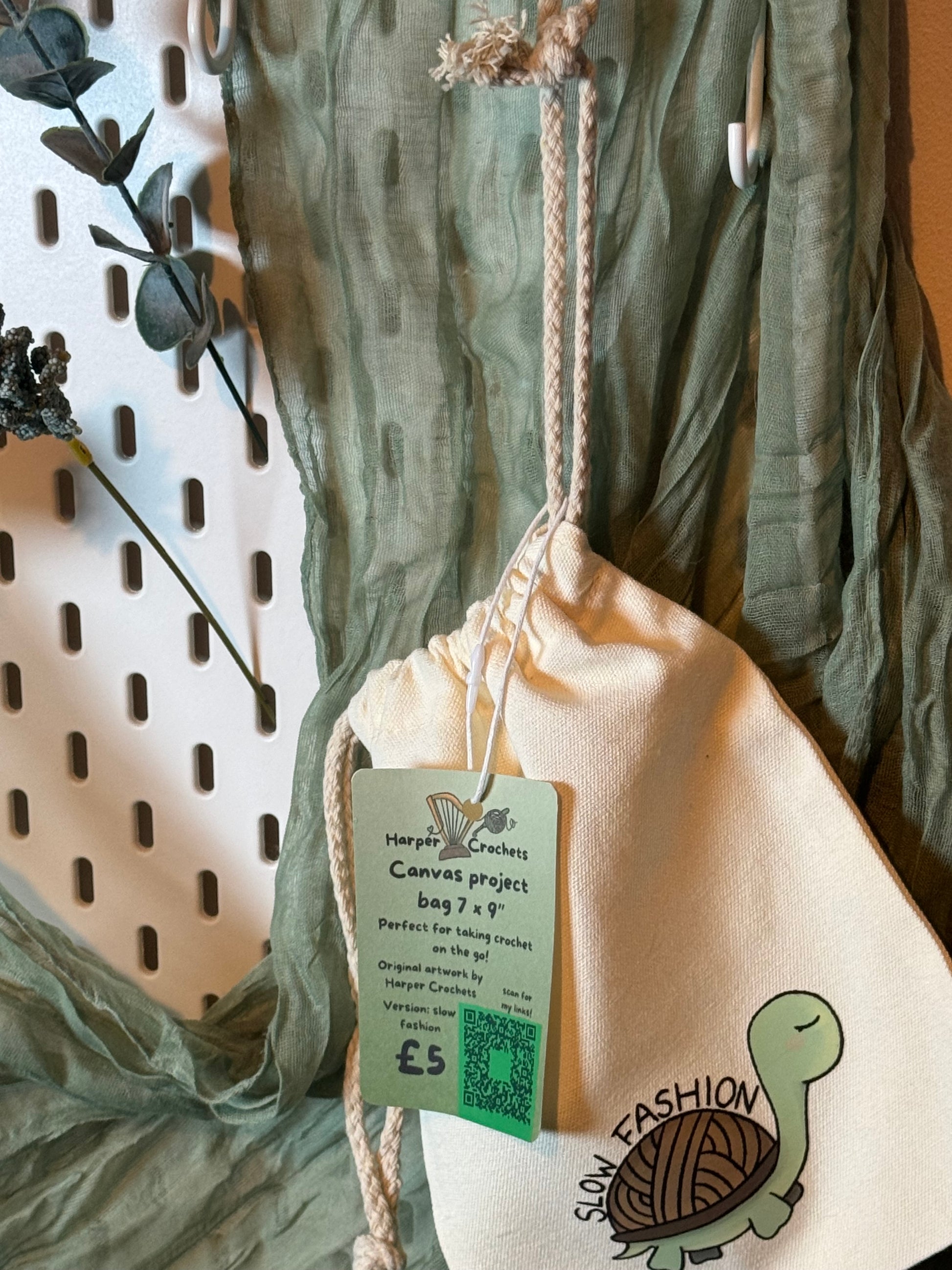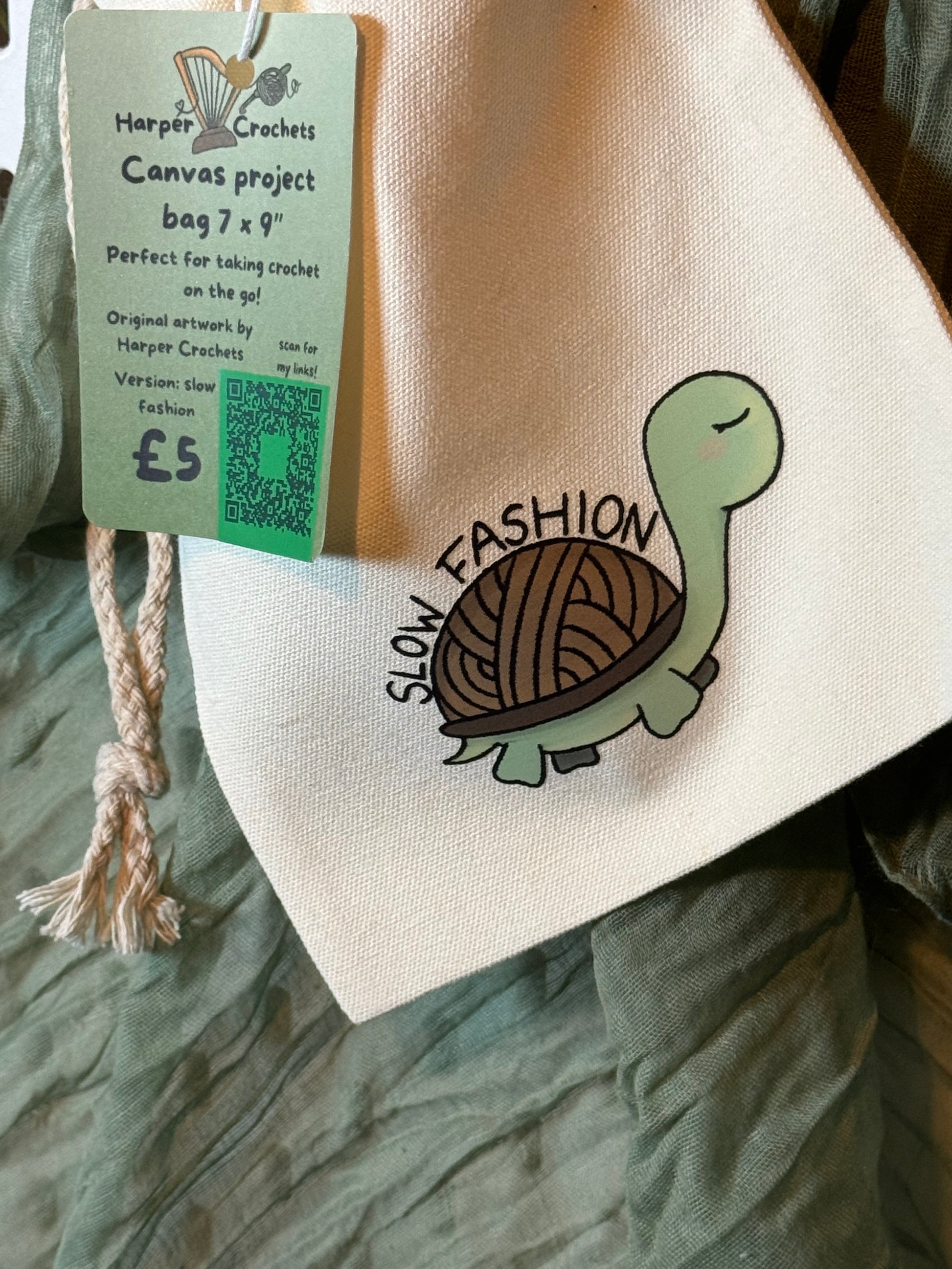 Project bag featuring my tortoise with a yarn shell design with the words “slow fashion”.