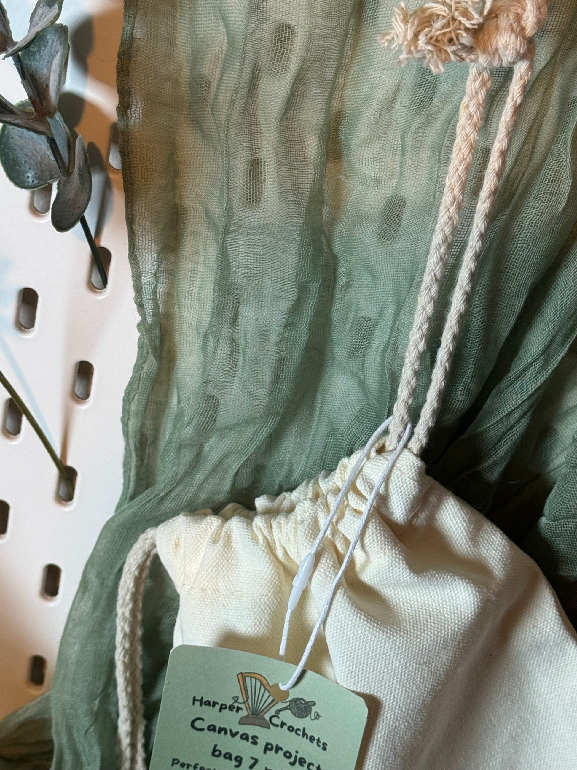 This project bag measures 7 x 9 inches so it’s nice and large for holding all sorts of crocheting and knitting essentials, as well as having a sturdy drawstring which are perfect for closing up the bag so nothing spills out!