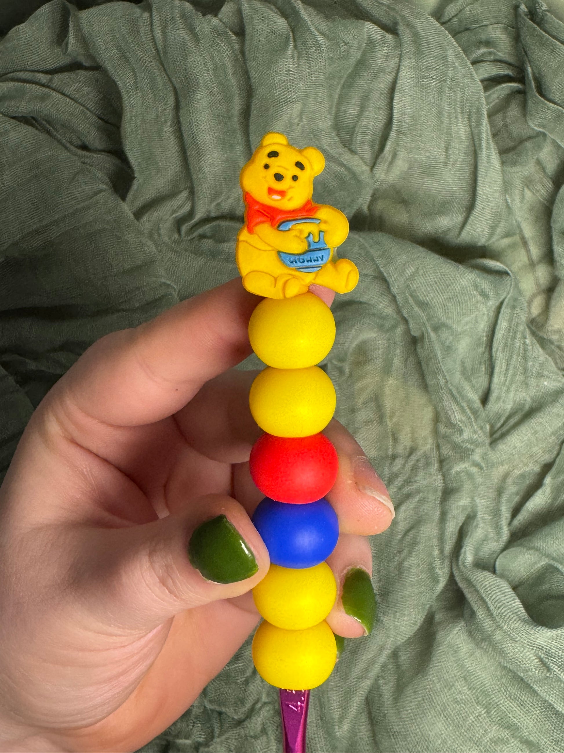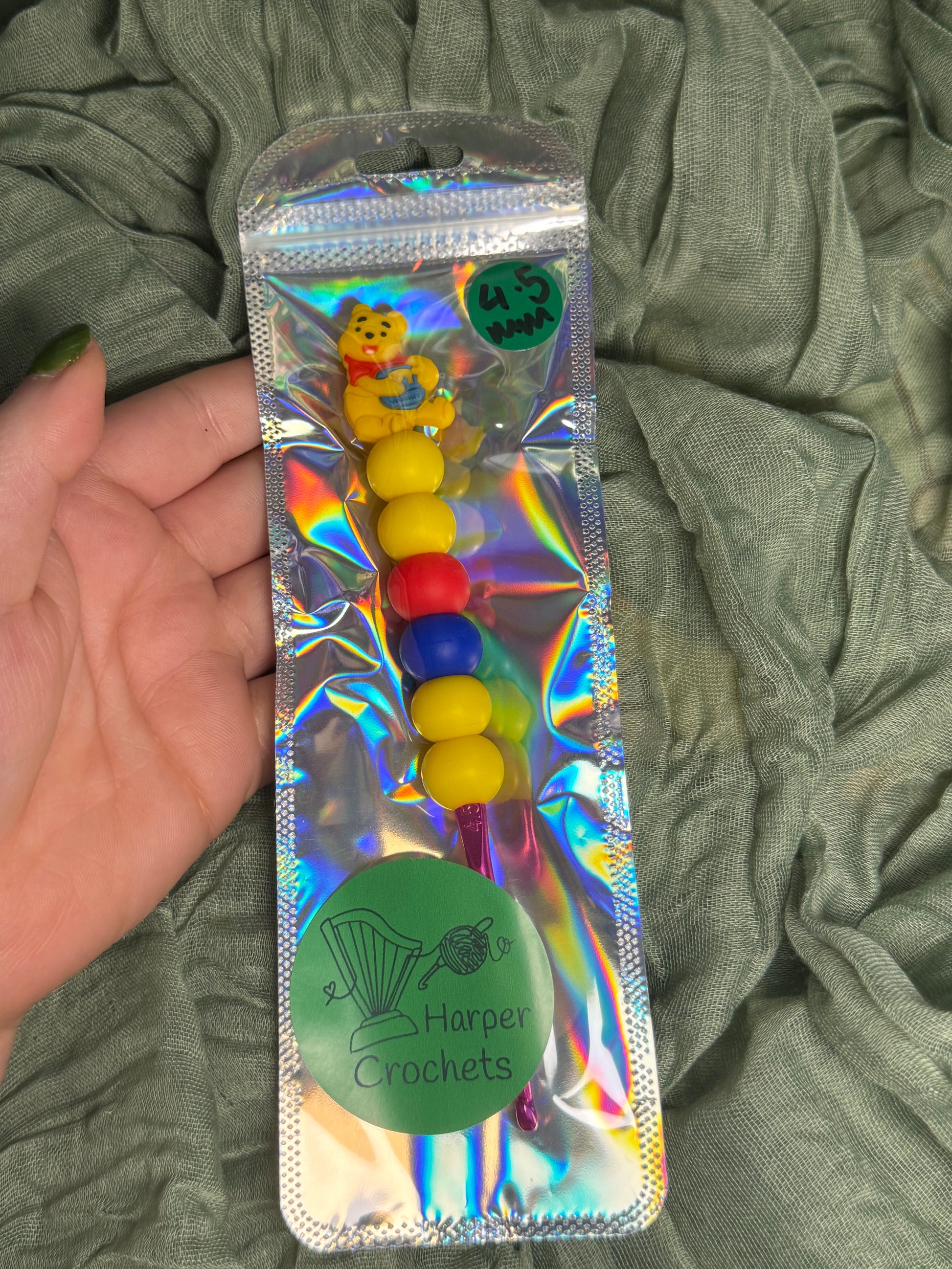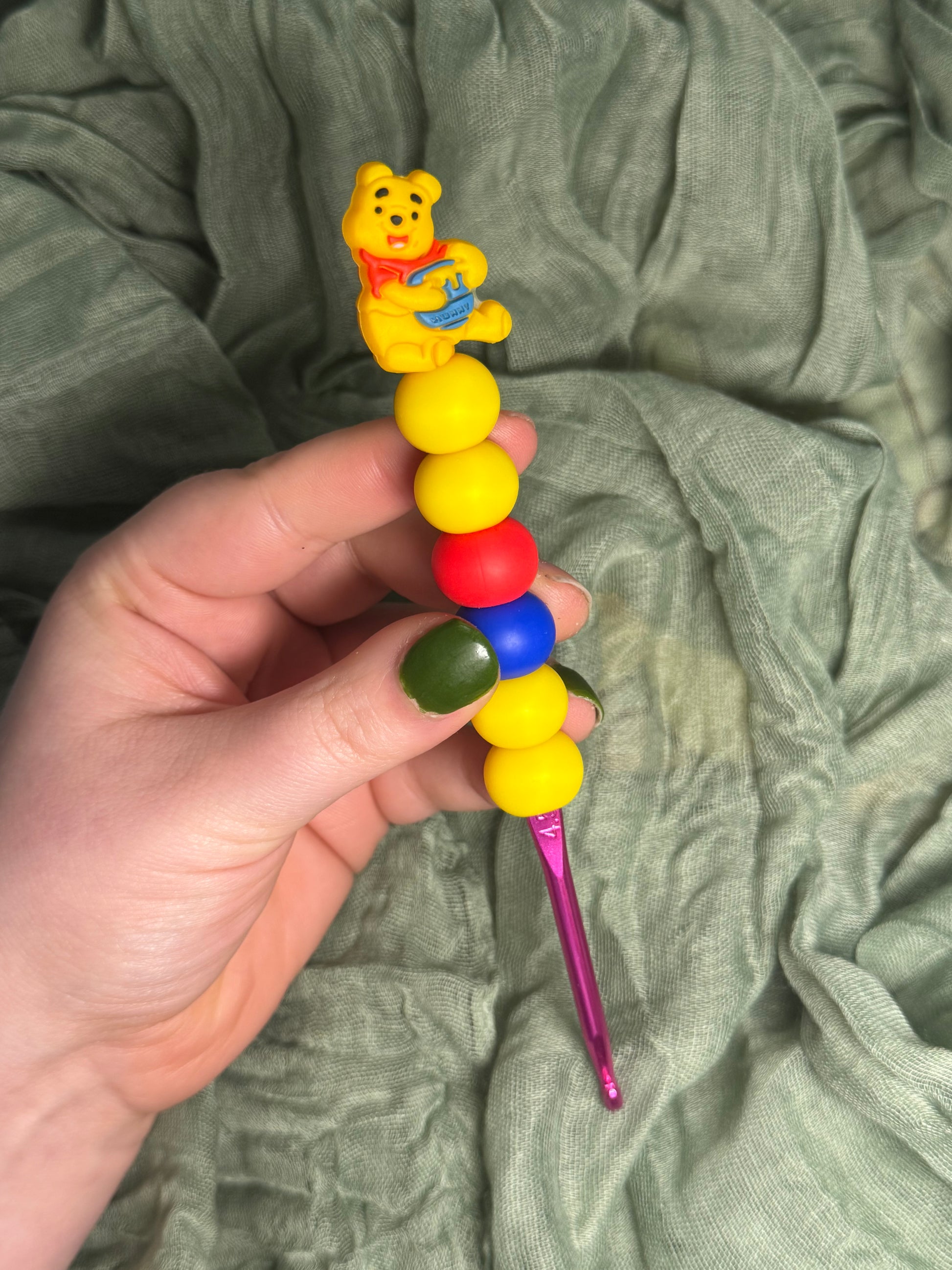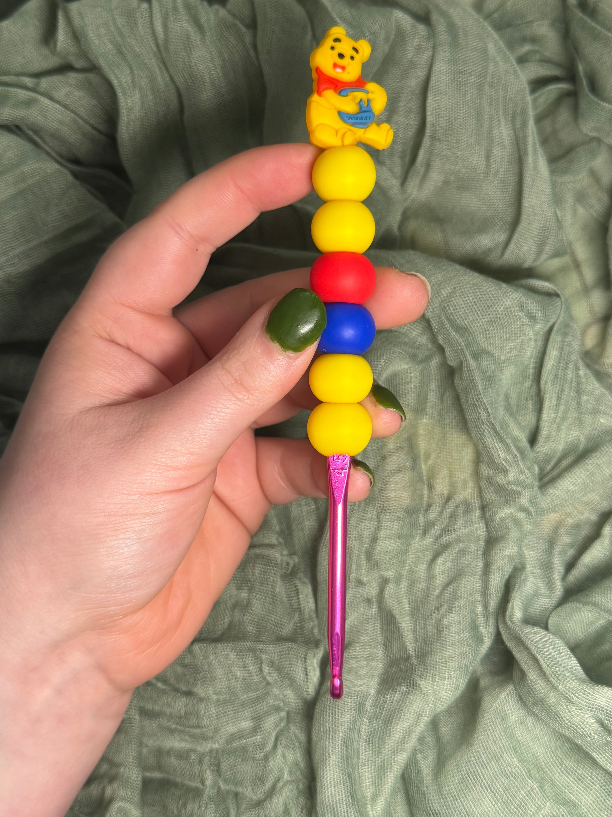 Handmade beaded crochet hook with Pooh bear holding his hunny topper and colour themed beads in a size 4.5mm hook.