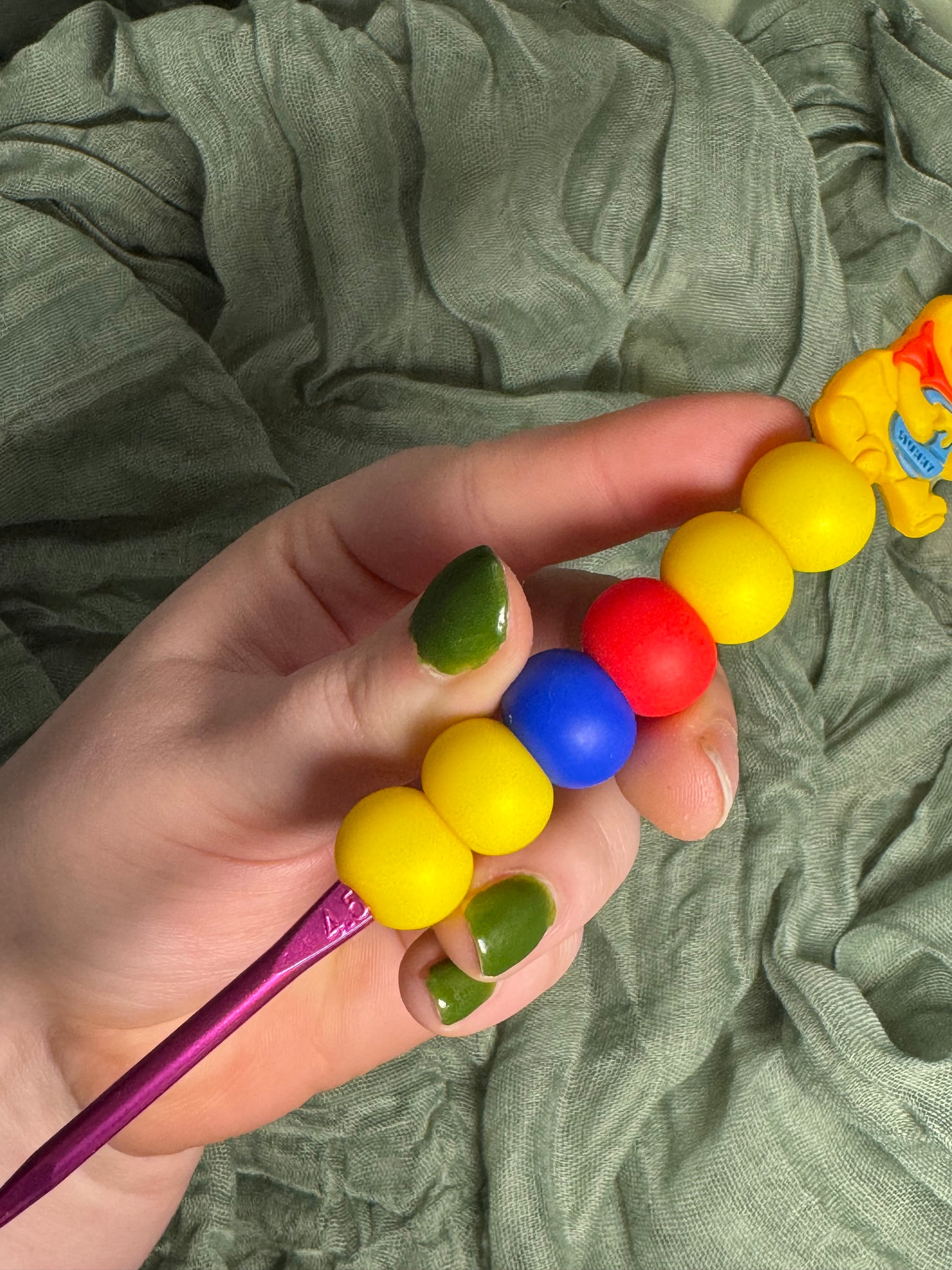 Please note: small parts! The beads are threaded onto the hook and relatively secure, but could be removed with force! If the topper or any beads come off, please simply thread them back on as soon as you can to avoid losing the beads.