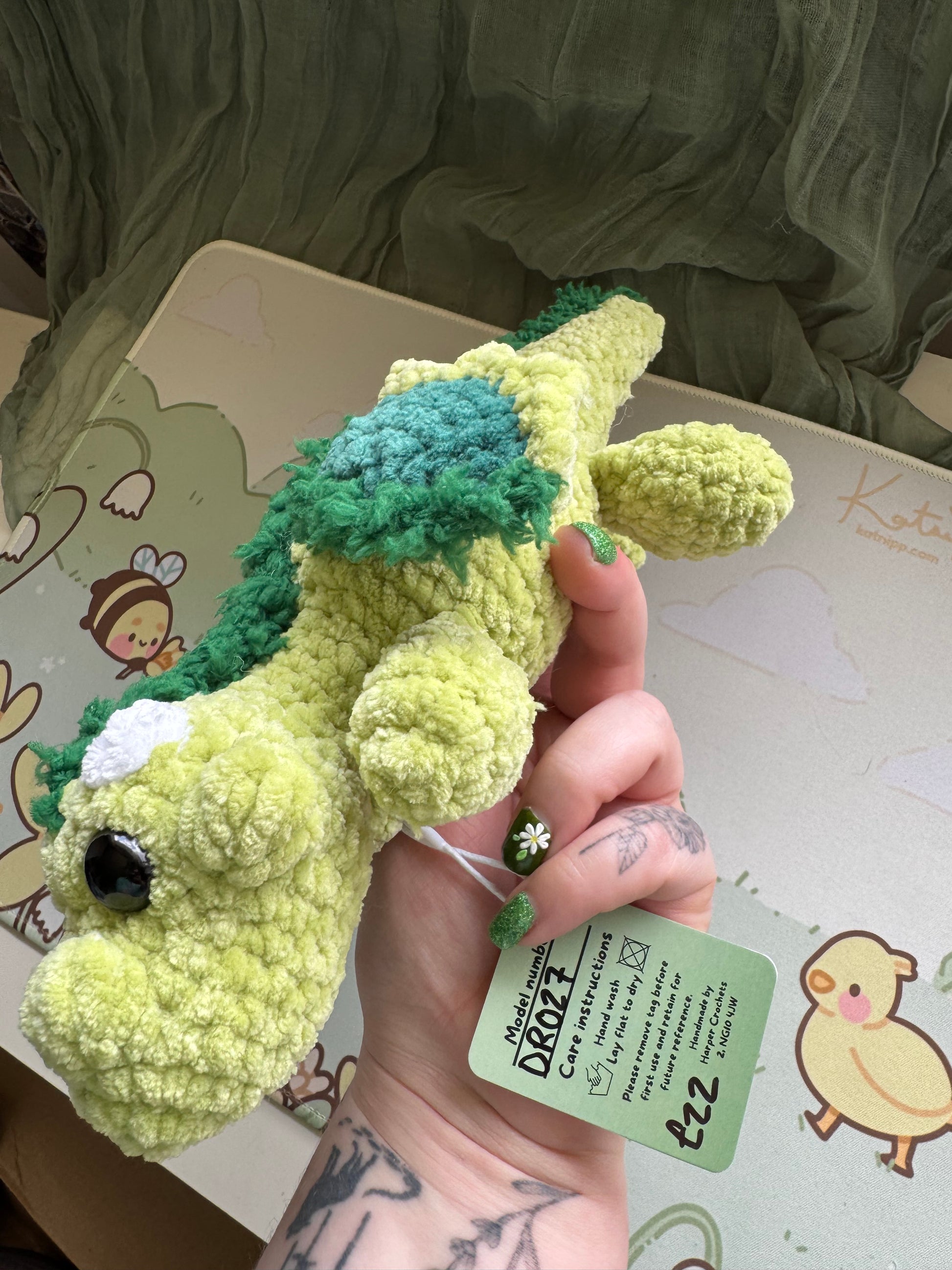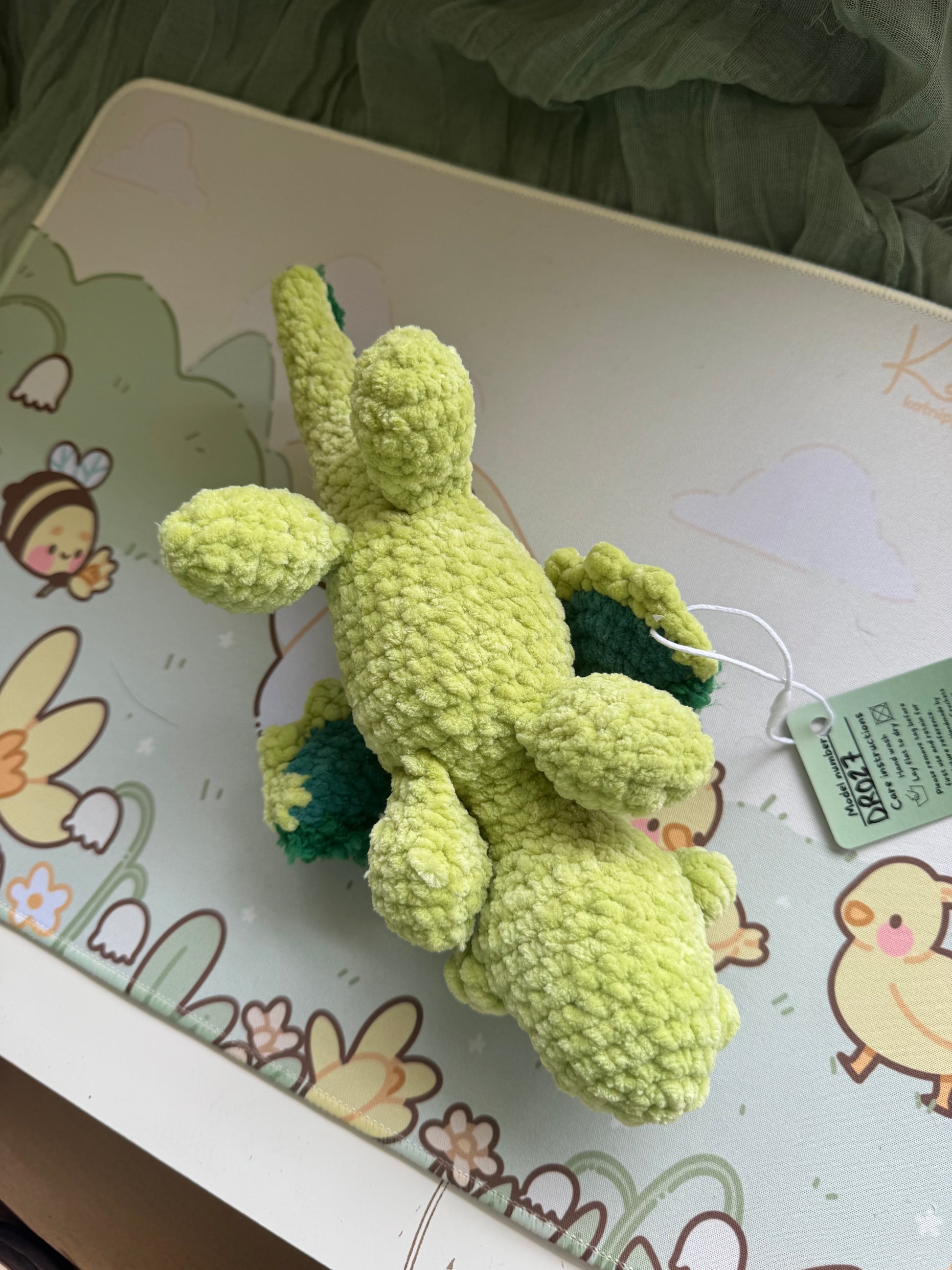 The first dragon pictured is made in a pistachio green for the body with a richer, deeper emerald green for the wings and faux fur accent.