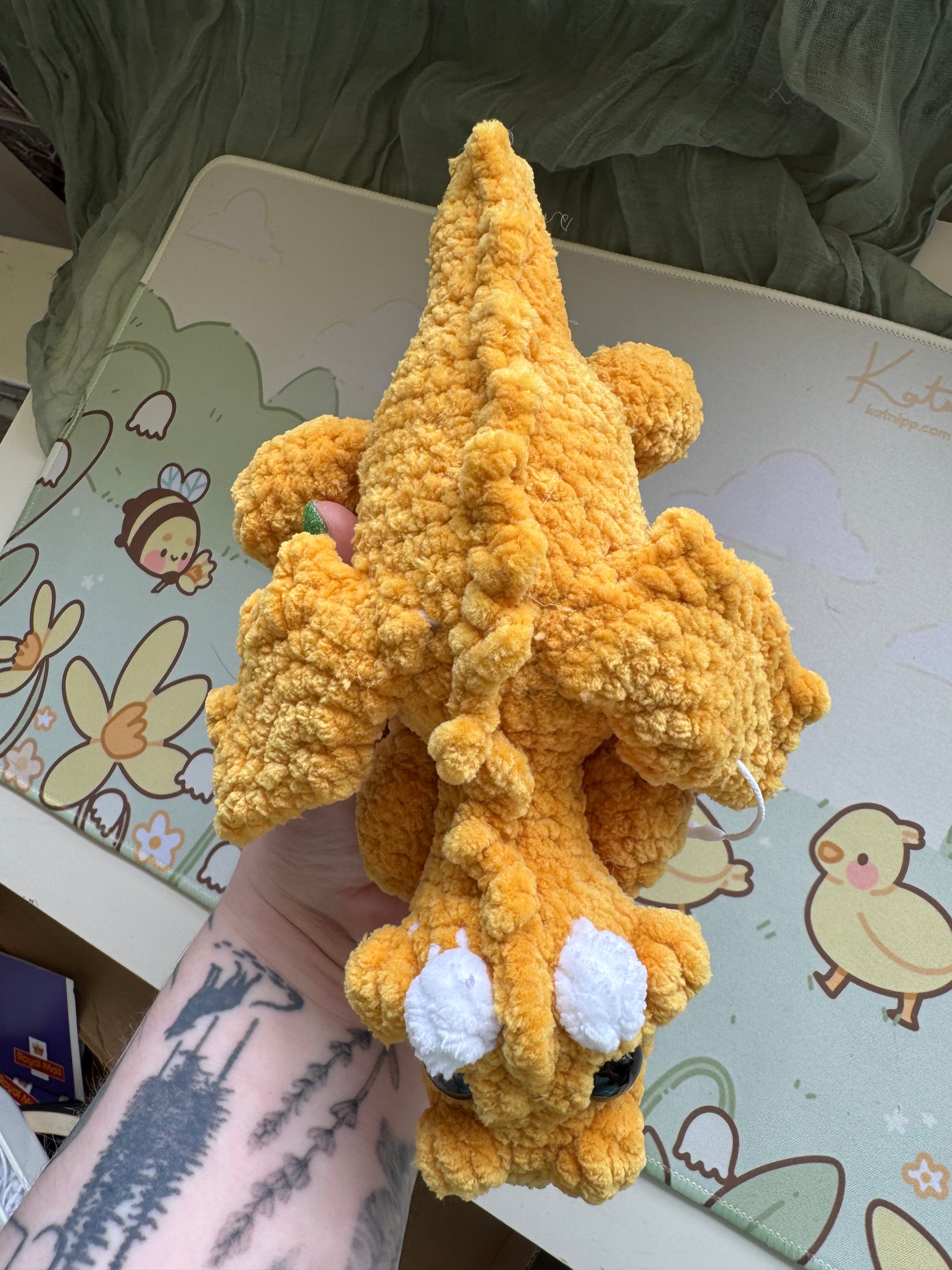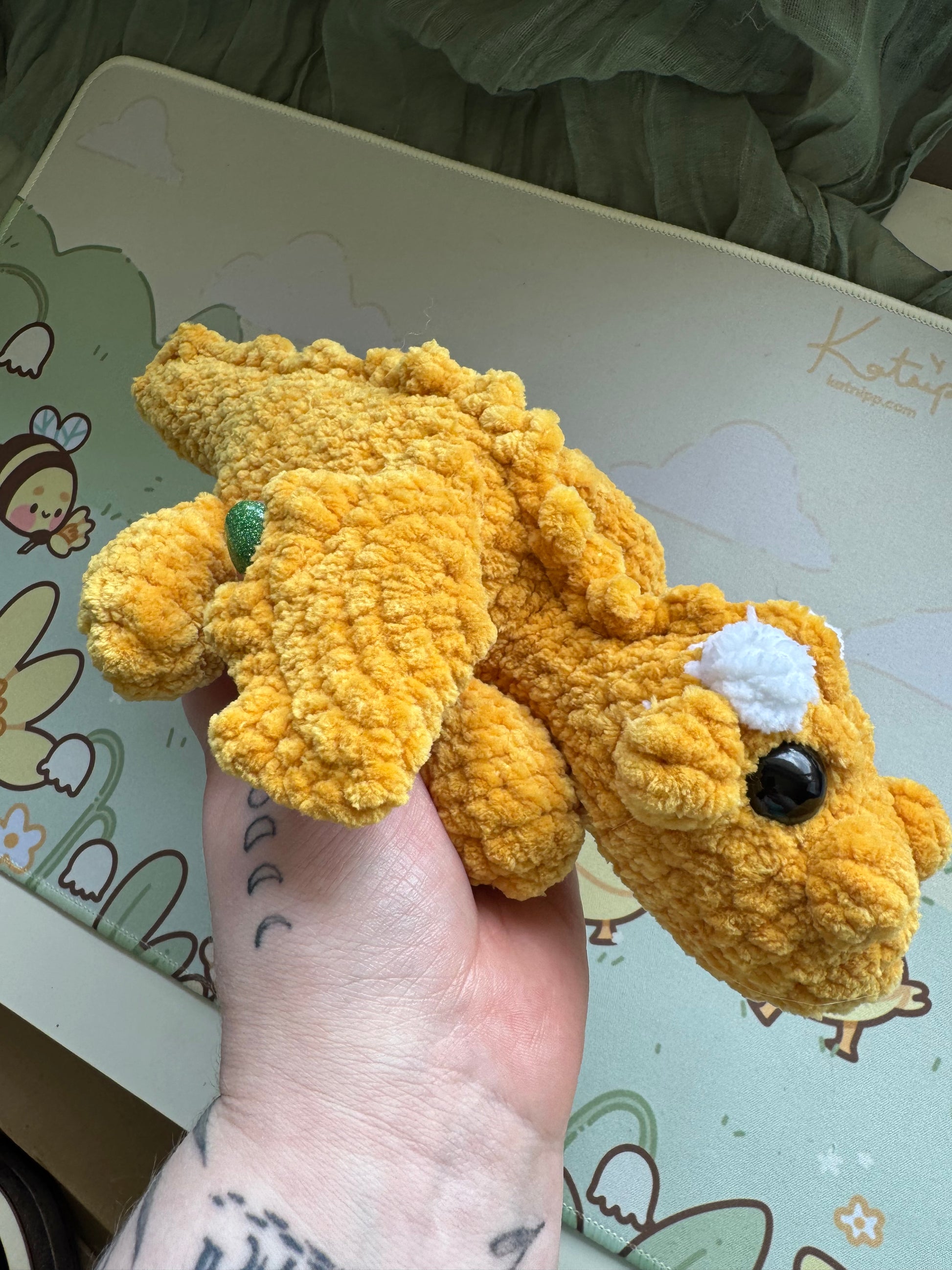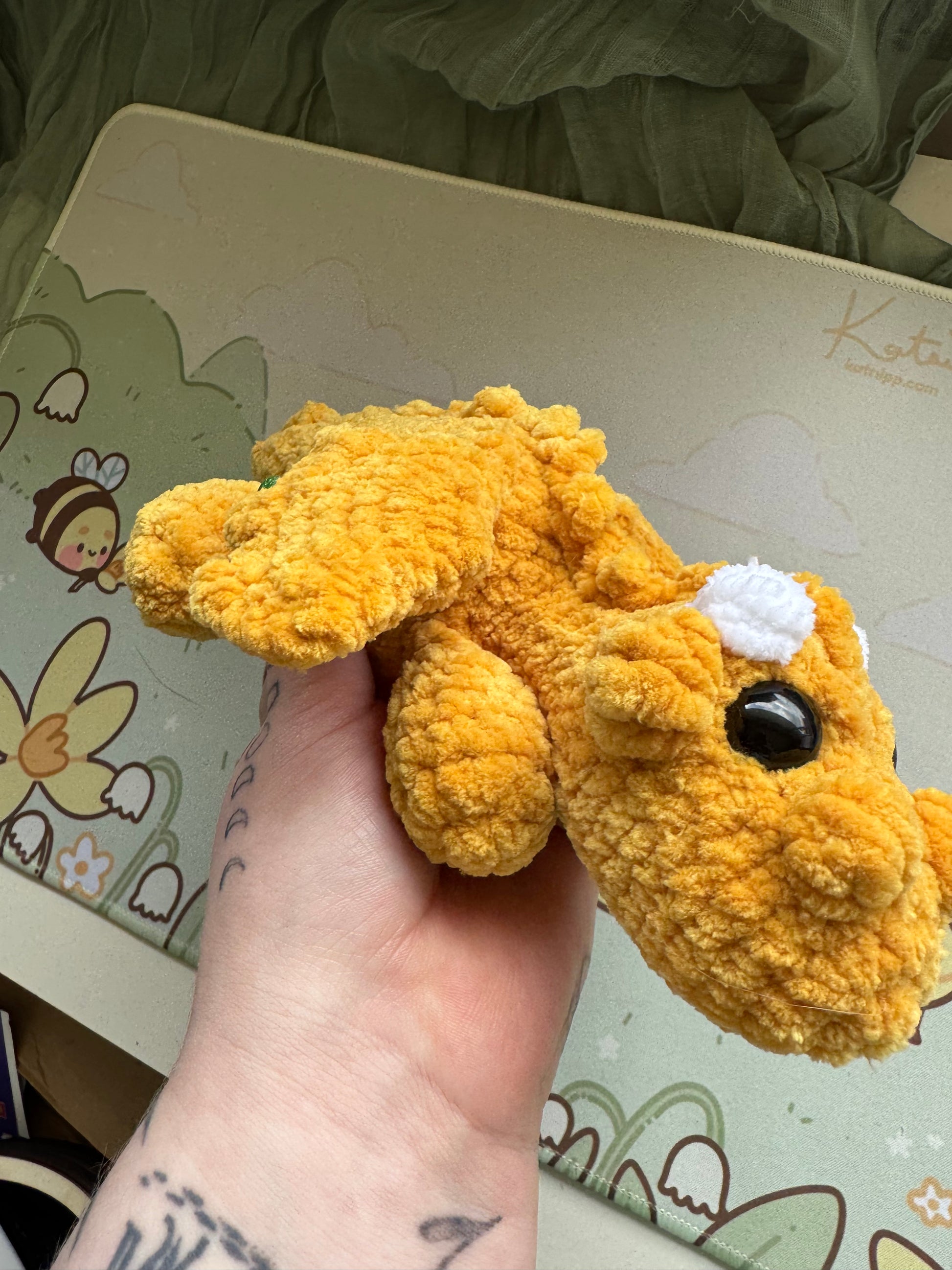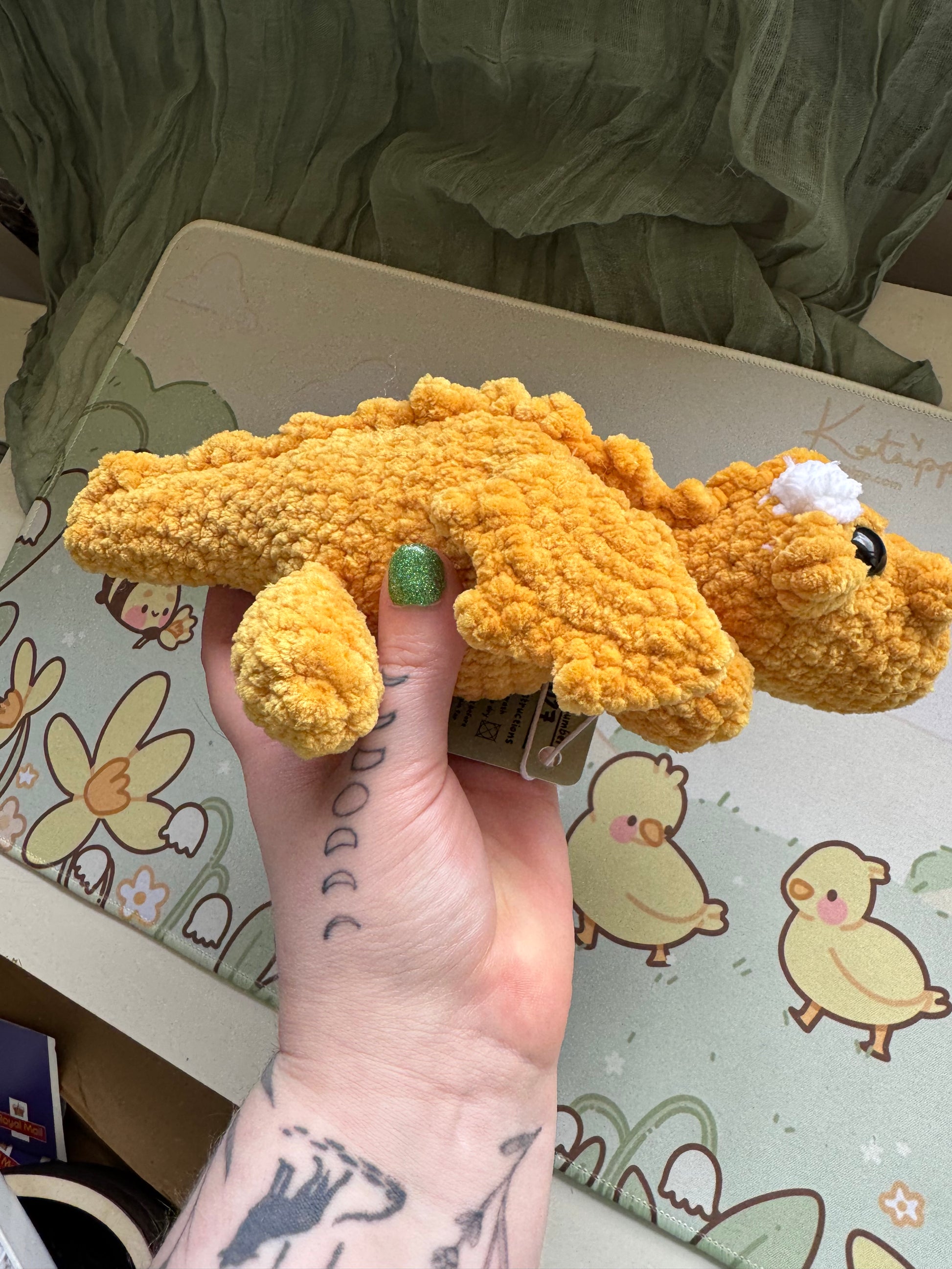 The final dragon I have available is all one solid colour! Made in a bright mustard gold colour, and instead of faux fur, has a strip of the same golden spikes down its back.