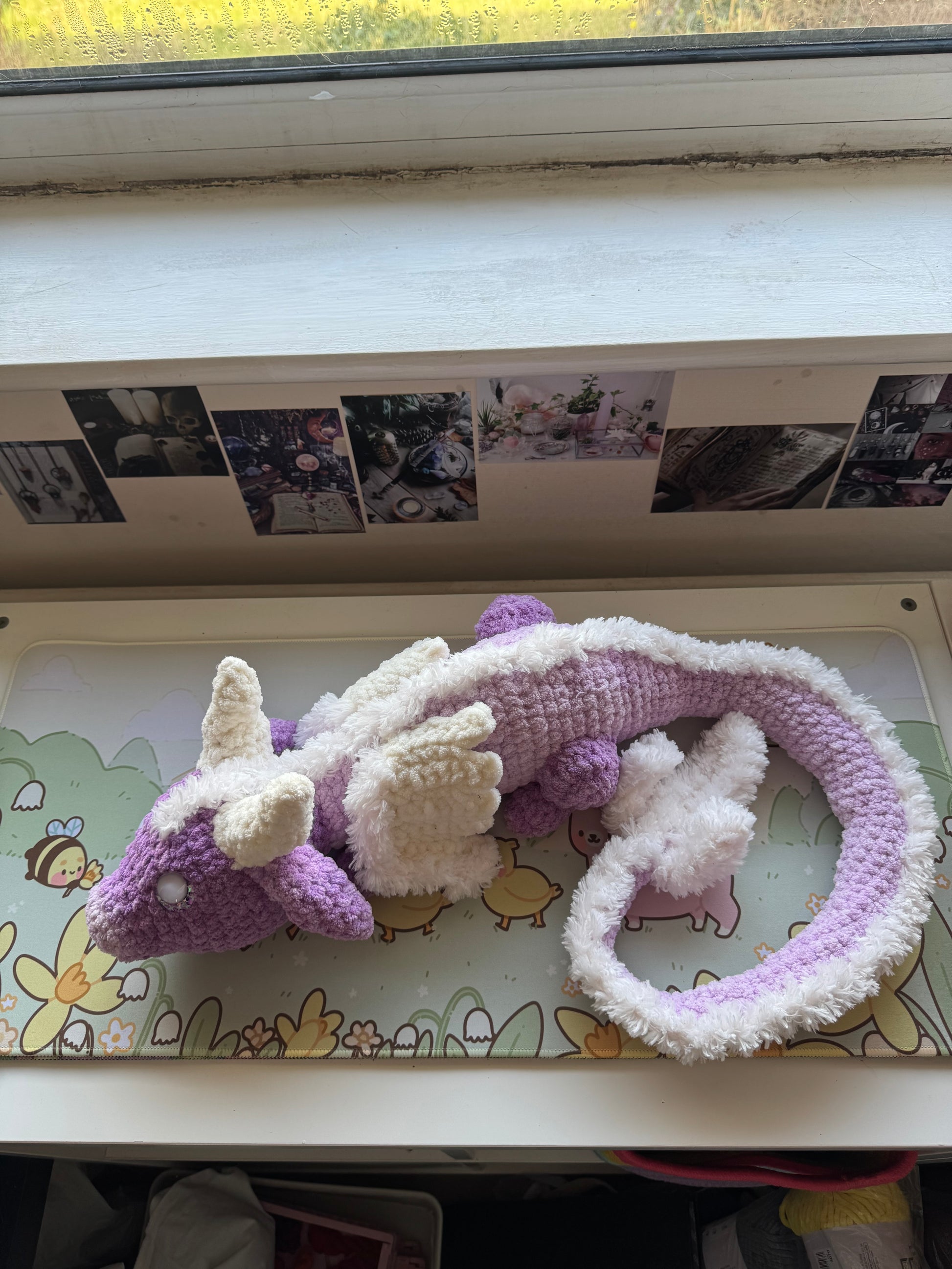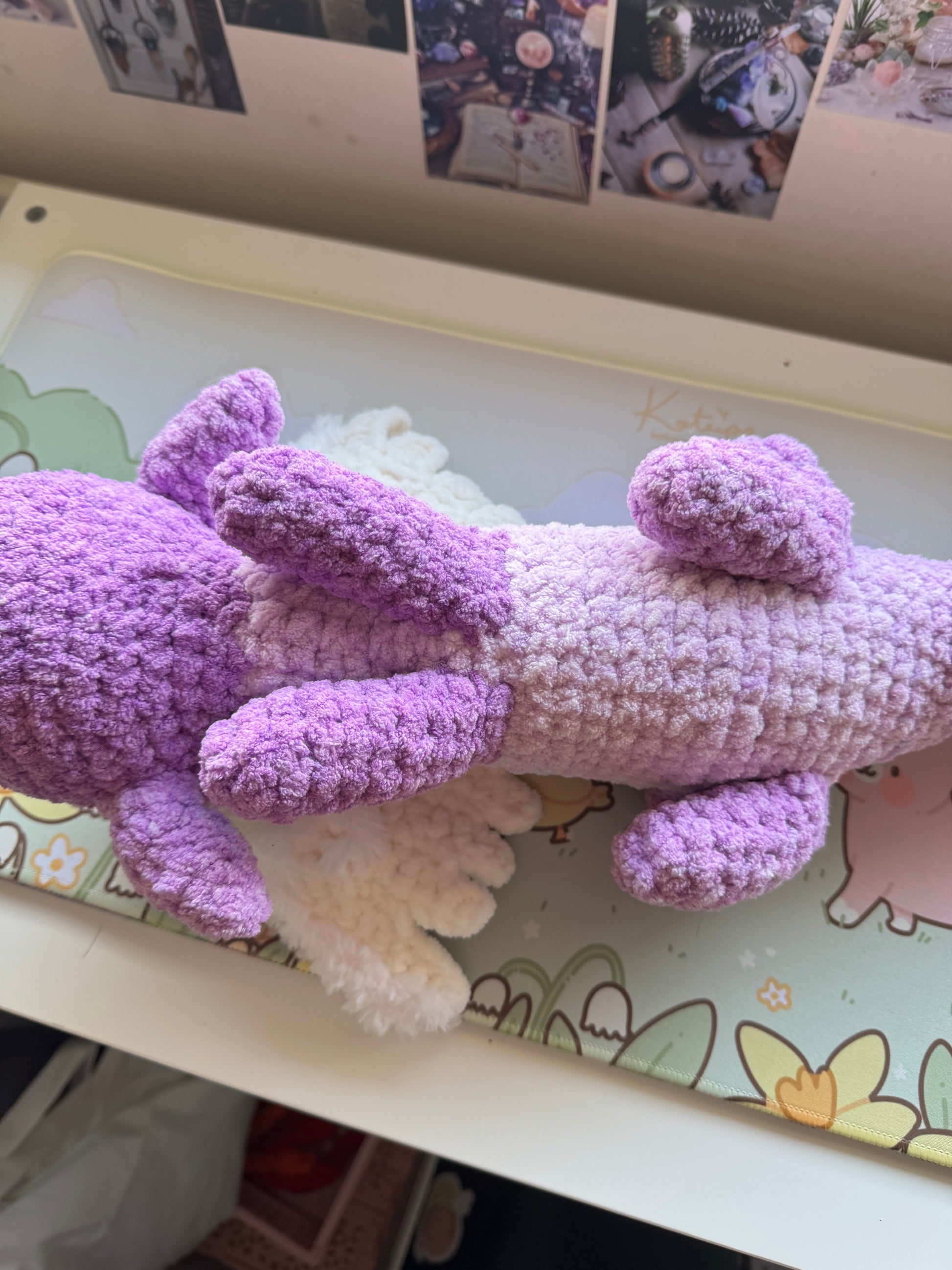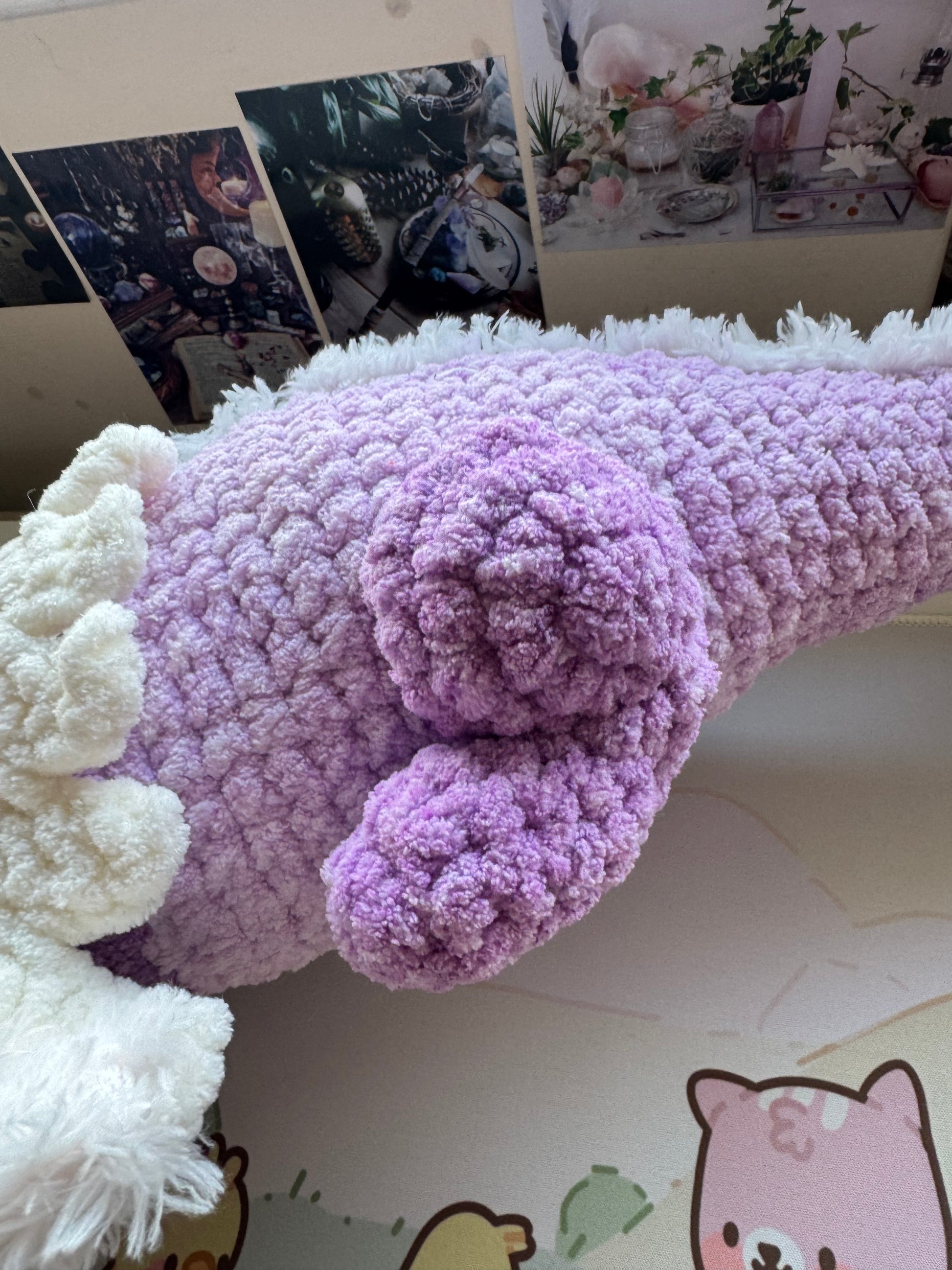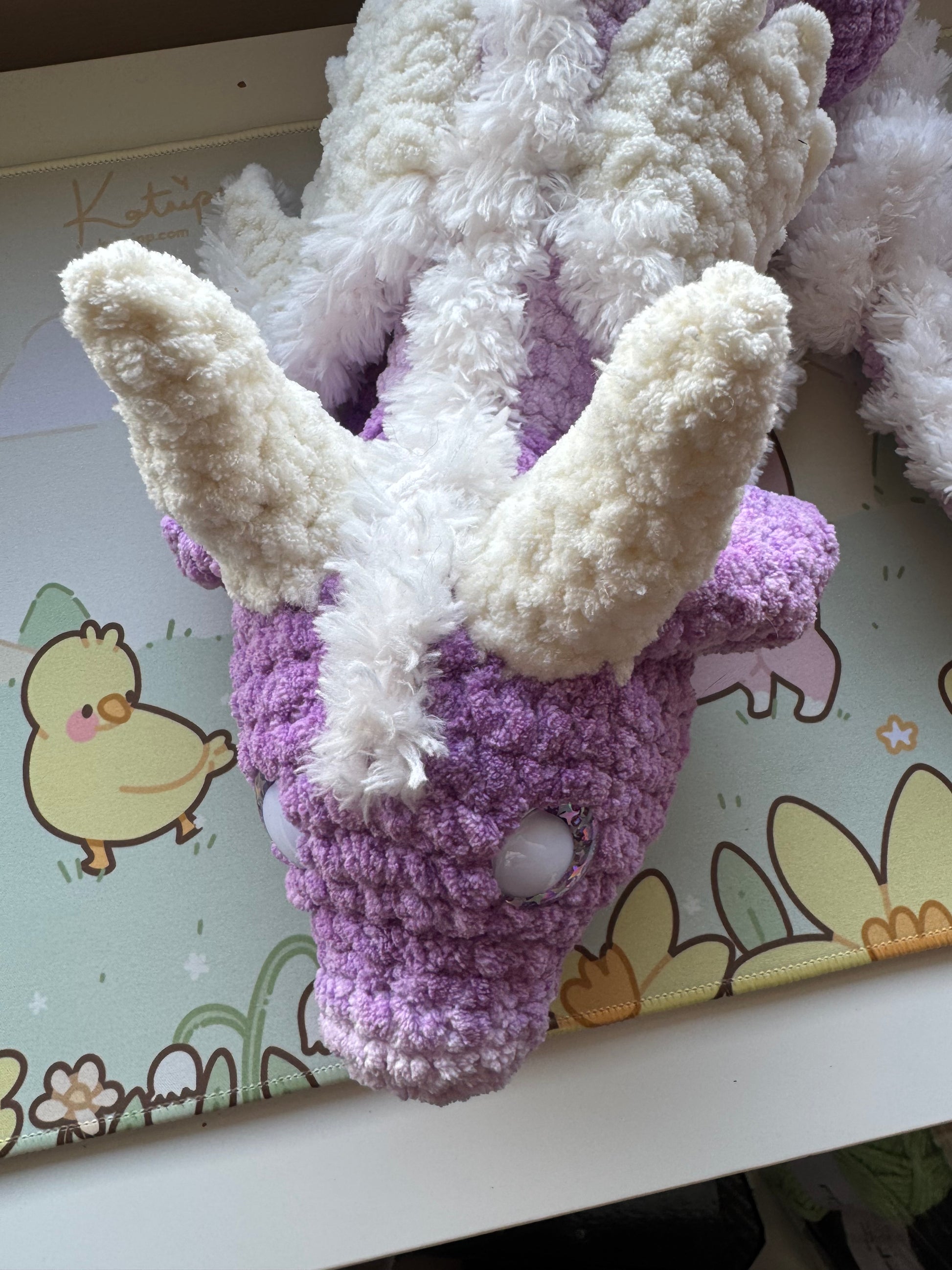 This ombre purple jumbo dragon needs a home! She's a large size with a very long luscious tail! She has twisty horns and faux fur details along her wing tips and all down her back and tail, with three furry tips to her tail. The eyes have holographic stars in them and were hand painted by myself specifically for this beautiful fantasy make, and they compliment her body colour wonderfully! The pattern by Red Mills Crochet names her "Winnie" and I think the name suits her perfectly! You are of course free to rename her to any name you like, and change her gender to anything you like as well! (I only give her a name and gender as I feel it gives her more personality, but it's not a permanent thing at all!)