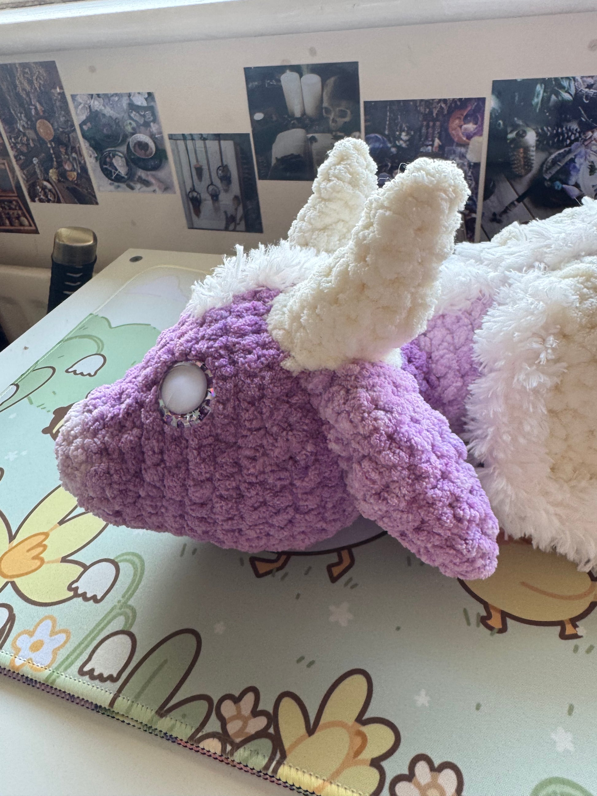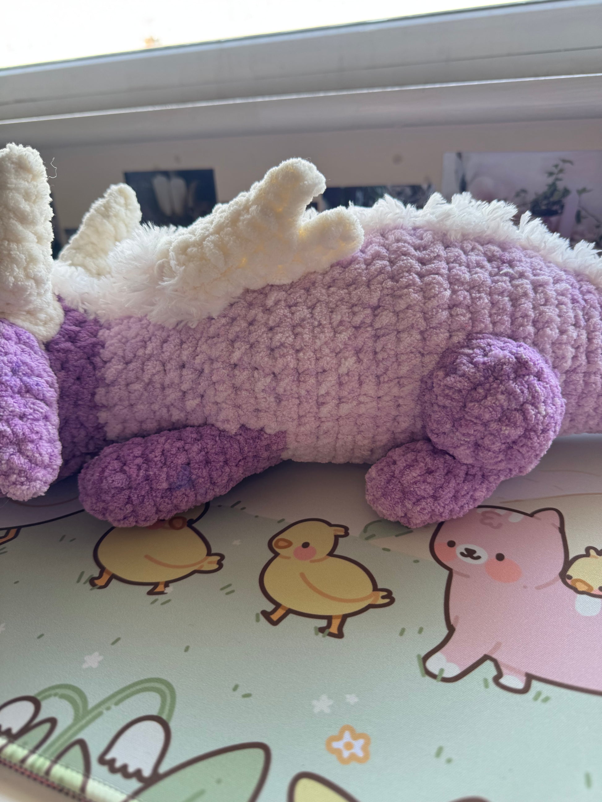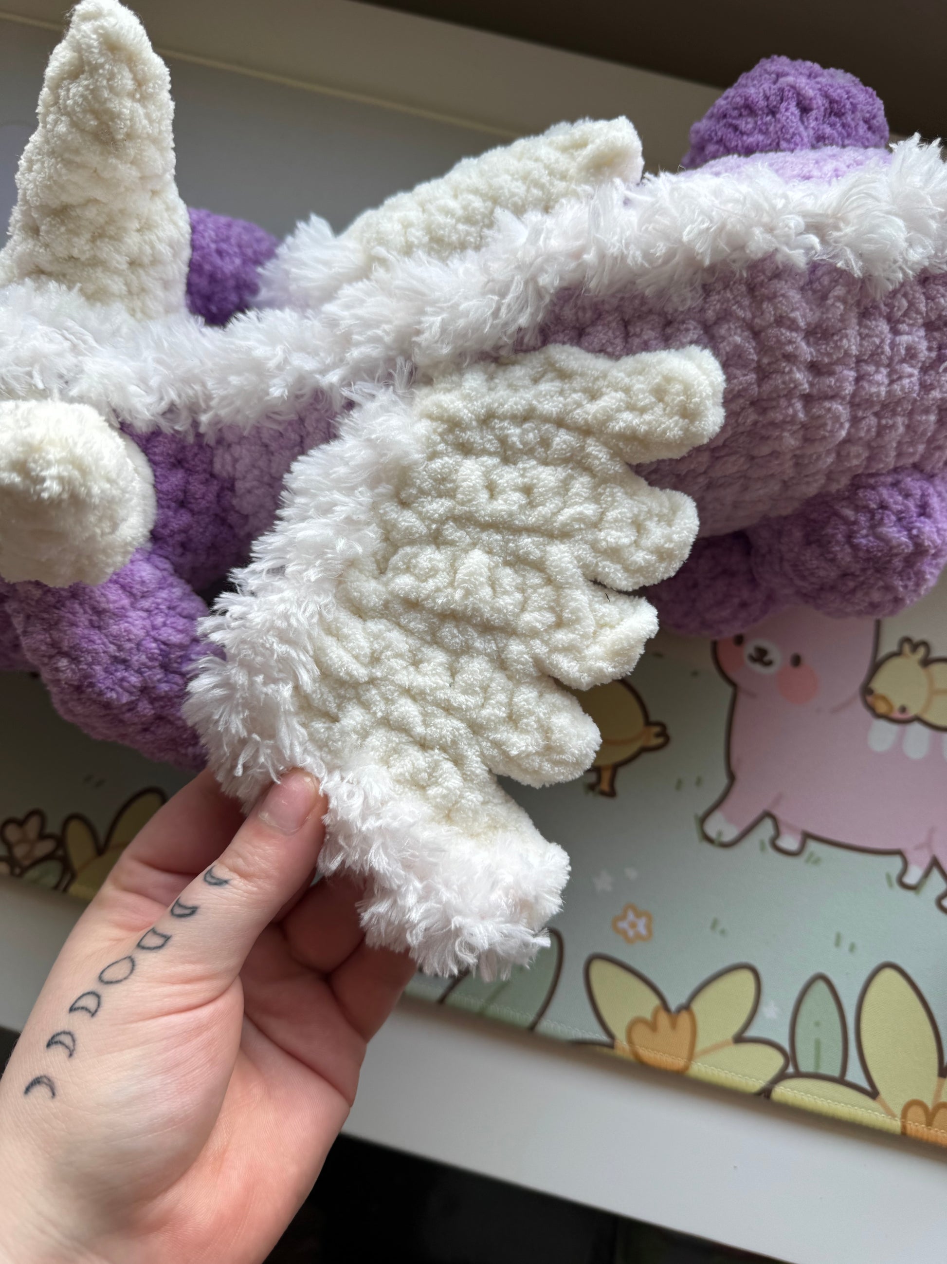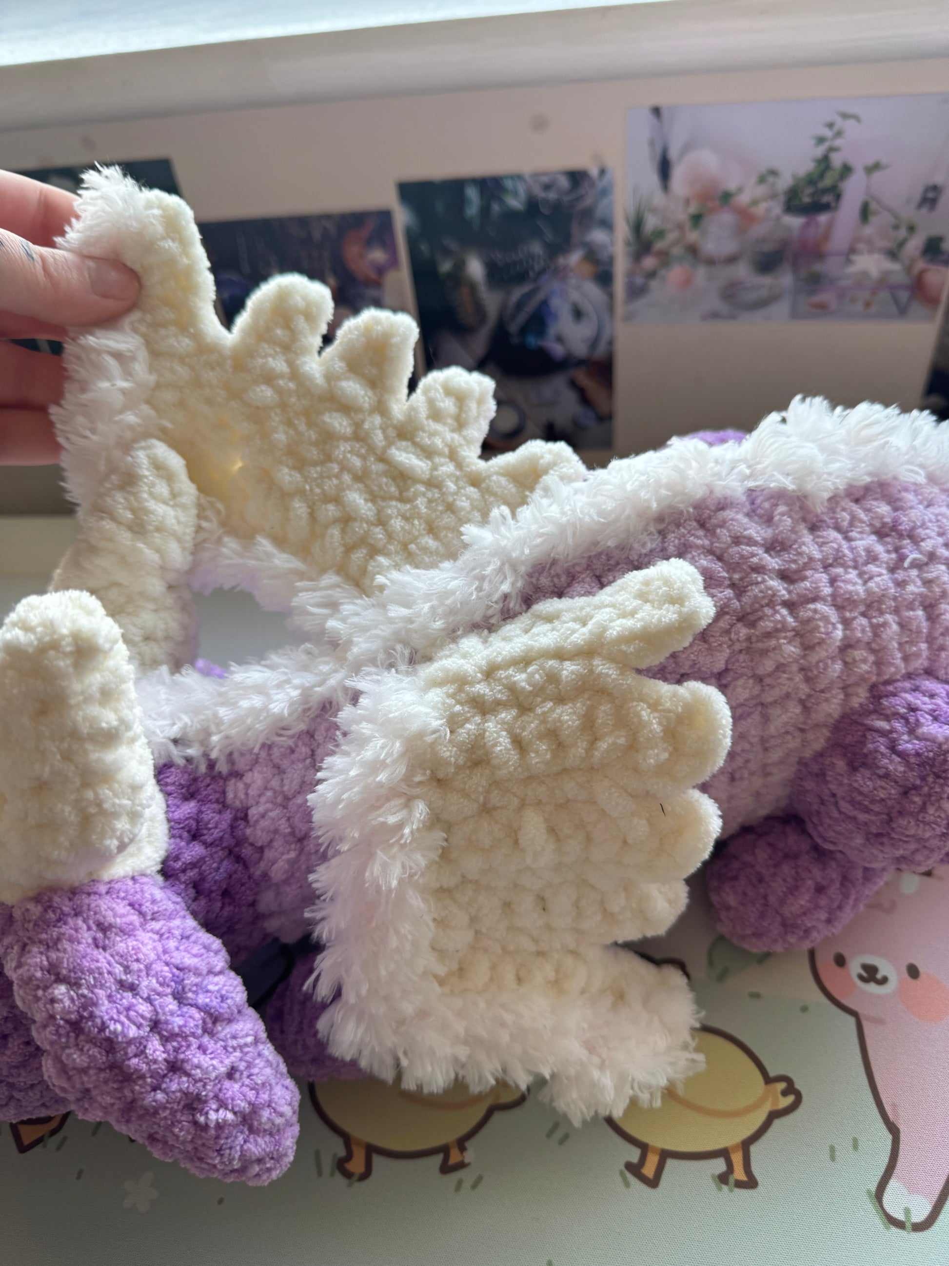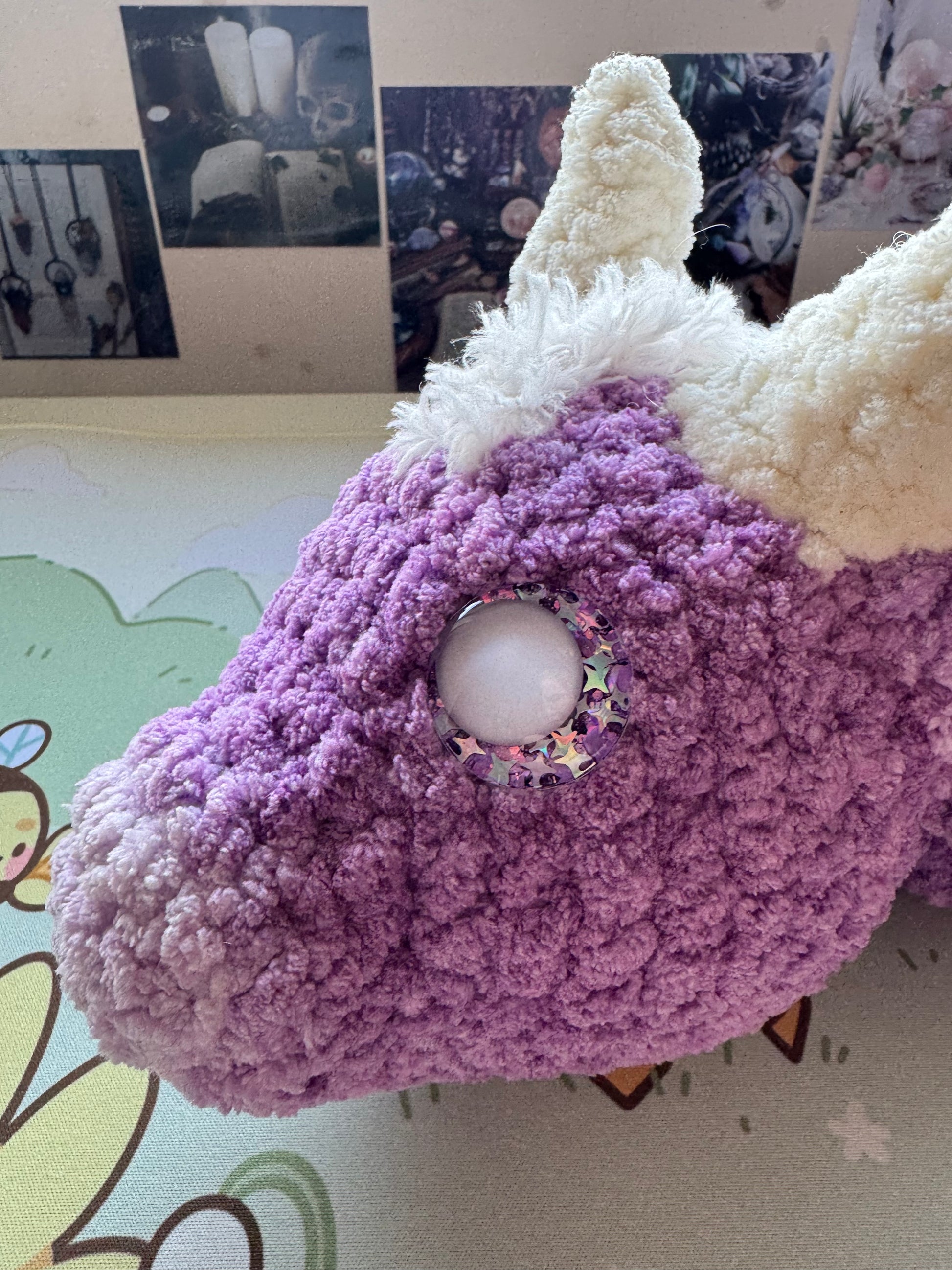 This ombre purple jumbo dragon needs a home! She's a large size with a very long luscious tail! She has twisty horns and faux fur details along her wing tips and all down her back and tail, with three furry tips to her tail. The eyes have holographic stars in them and were hand painted by myself specifically for this beautiful fantasy make, and they compliment her body colour wonderfully! The pattern by Red Mills Crochet names her "Winnie" and I think the name suits her perfectly! You are of course free to rename her to any name you like, and change her gender to anything you like as well! (I only give her a name and gender as I feel it gives her more personality, but it's not a permanent thing at all!)