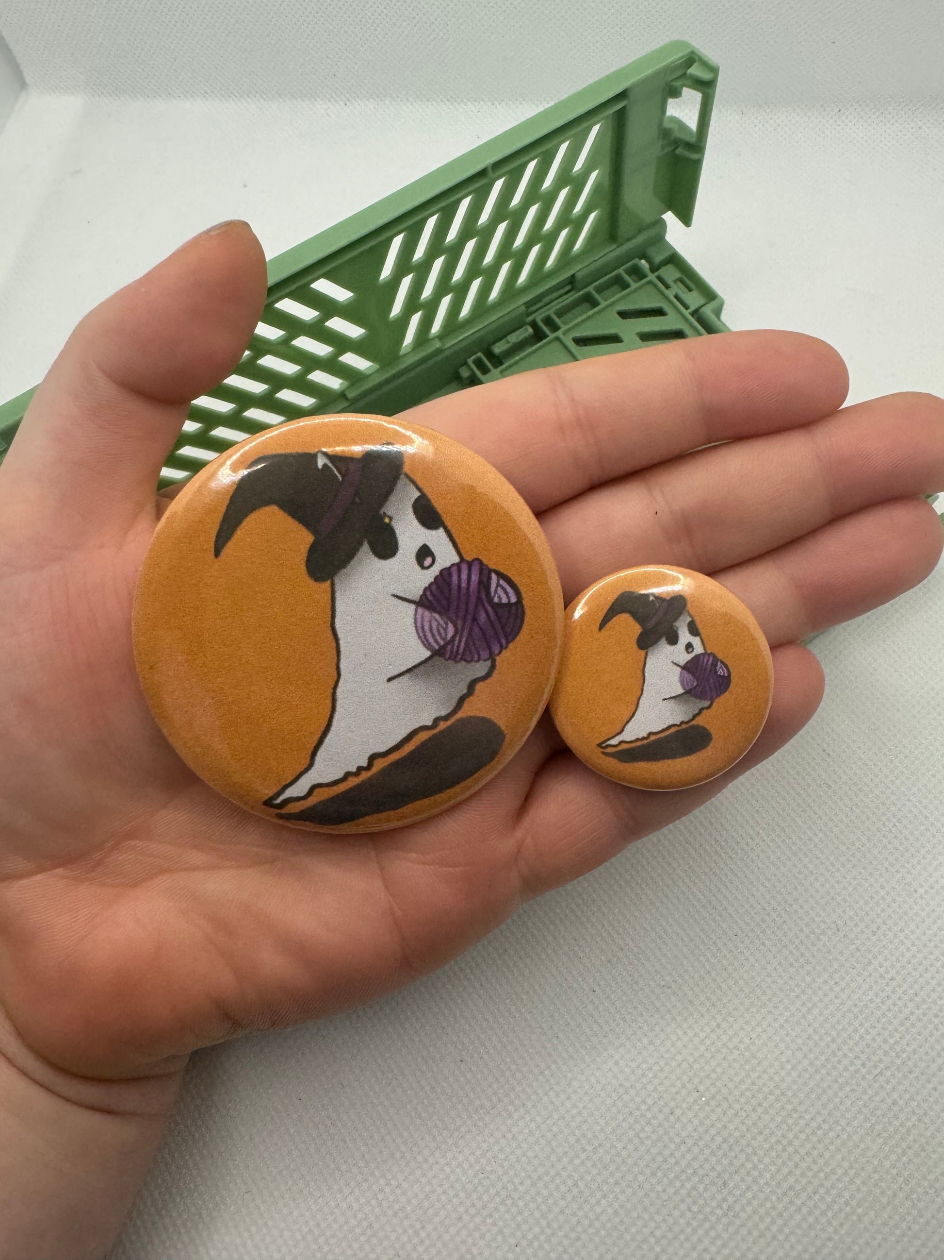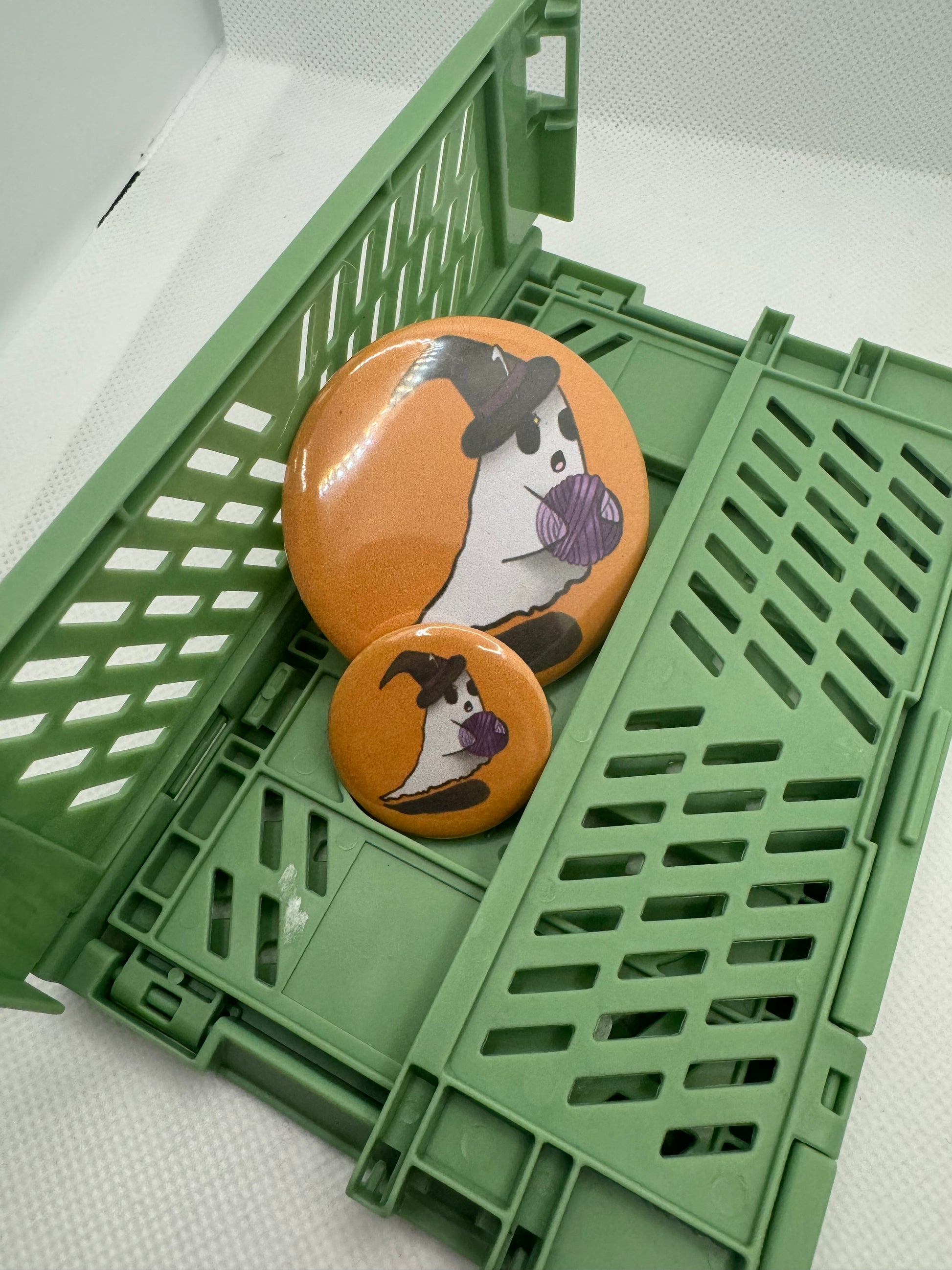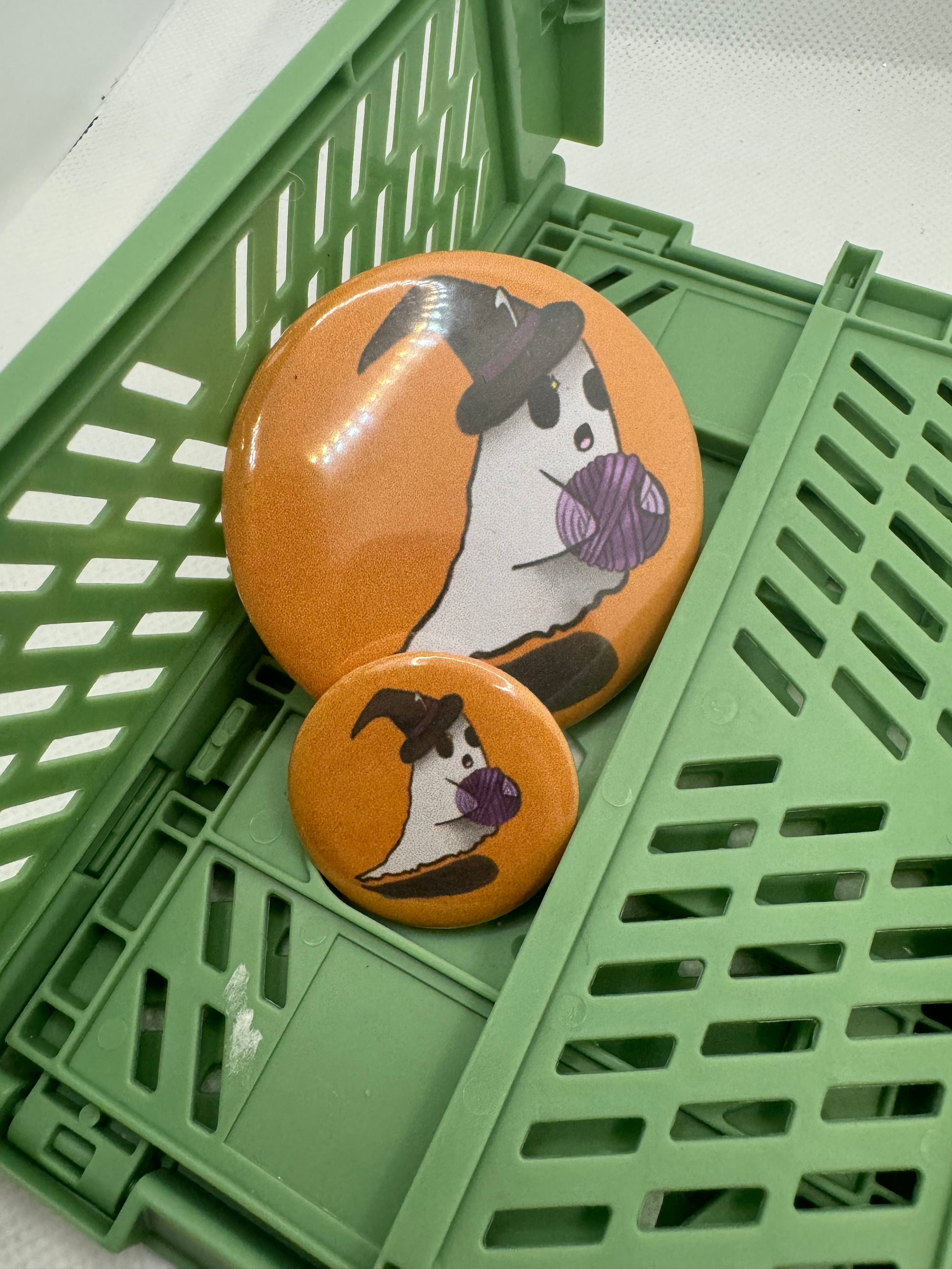 Button badge featuring my ghost wearing a witch hat and carrying a ball of yarn design on a spooky orange background.
