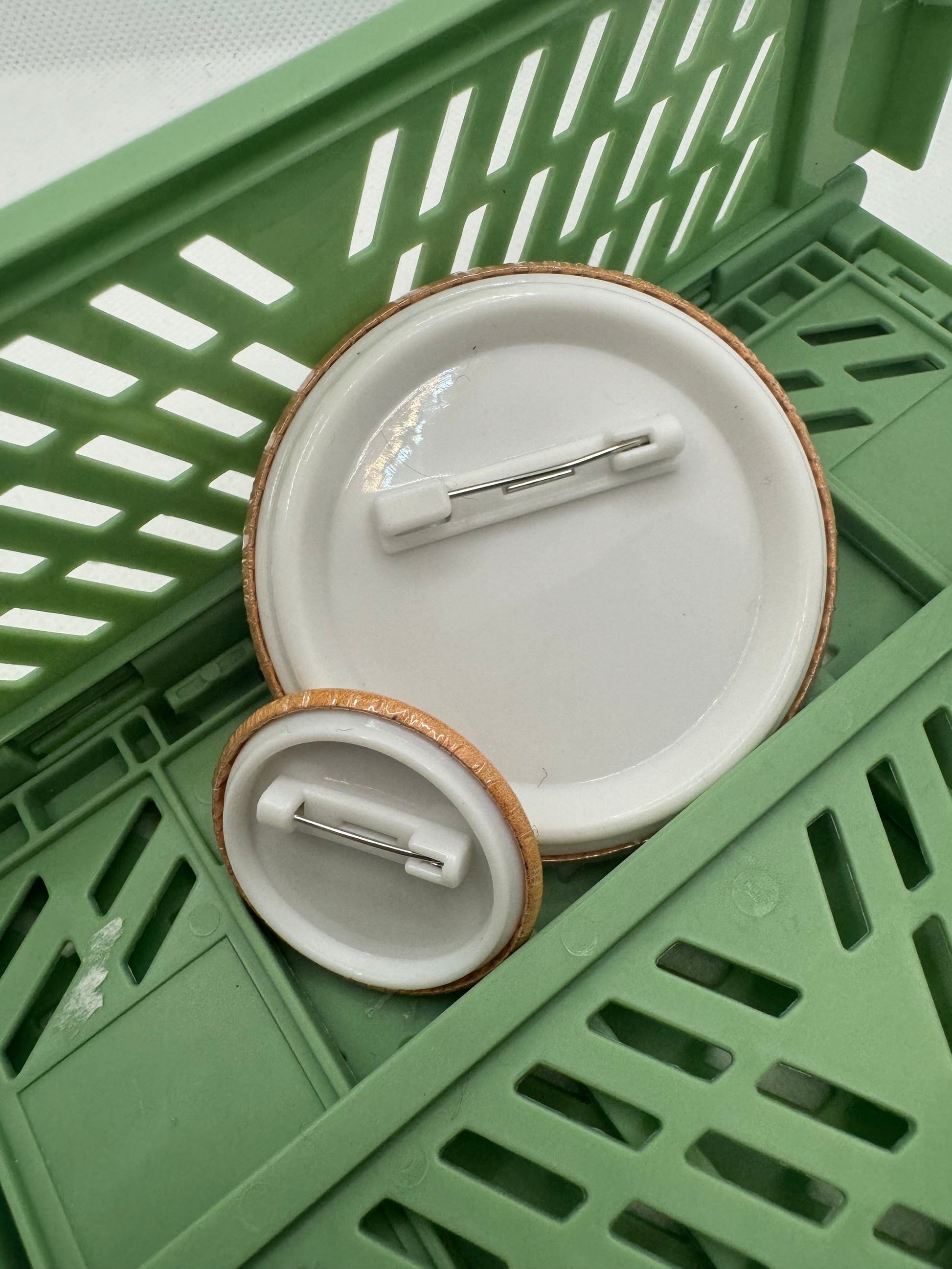 It is made from a metal front piece and plastic badge back with a metal pin for securing to your bag or shirt etc! The design is printed at home by me, Harper, and pressed onto the badge with my badge machine! The artwork is original to Harper Crochets, and is drawn on my iPad!